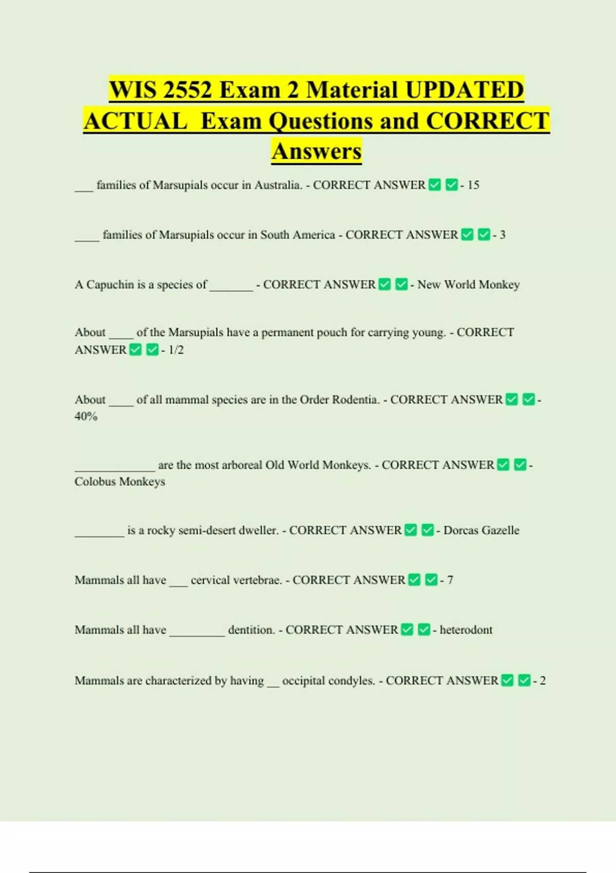 WIS 2552 Exam 2 Material UPDATED ACTUAL Exam Questions and CORRECT Answers ___ families of Marsupials occur in Australia. - CORRECT ANSWER ____ families of Marsupials occur in South America - CORRECT ANSWER A Capuchin is a species of _______ - CORRECT ANSWER - 1/2