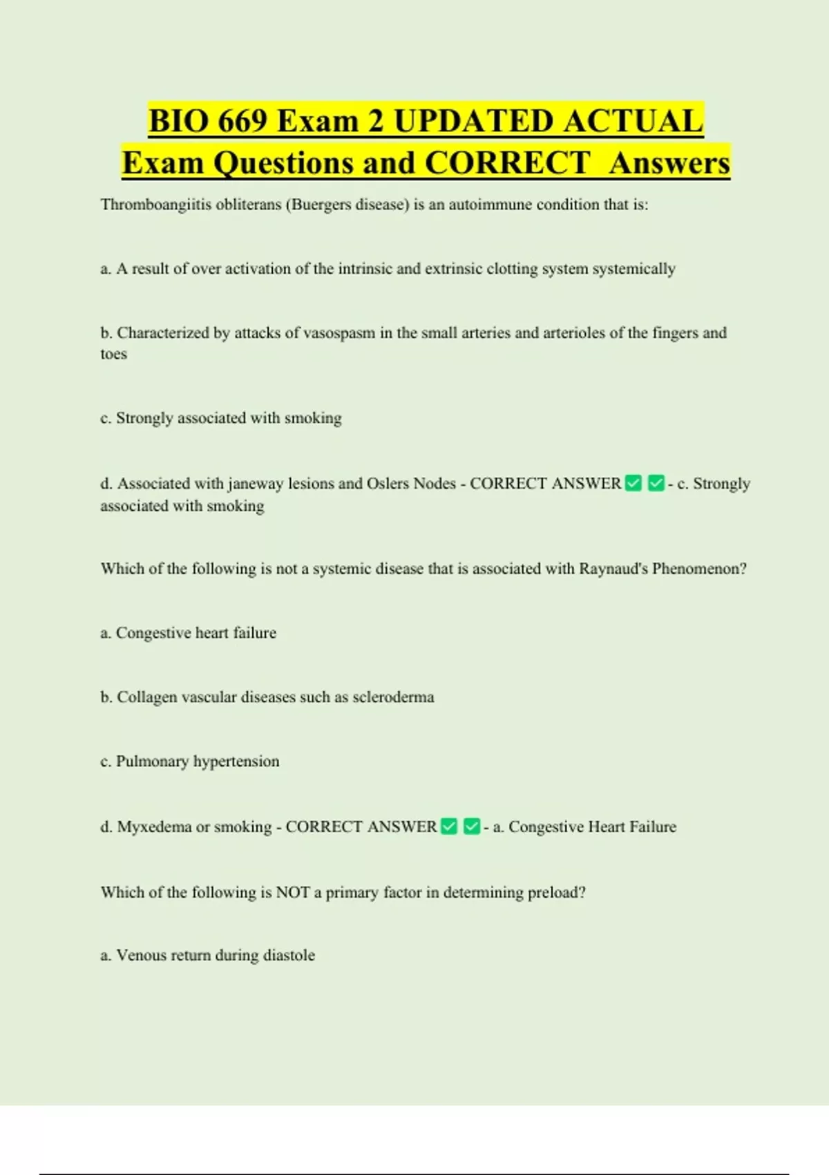 BIO 669 Exam 2 UPDATED ACTUAL Exam Questions and CORRECT Answers Thromboangiitis obliterans (Buergers disease) is an autoimmune condition that is: a. A result of over activation of the intrinsic and extrinsic clotting system systemically b. Characterized by attacks of vasospasm in the small arteries and arterioles of the fingers and toes c. Strongly associated with smoking d. Associated with janeway lesions and Oslers Nodes - CORRECT ANSWER associated with smokin