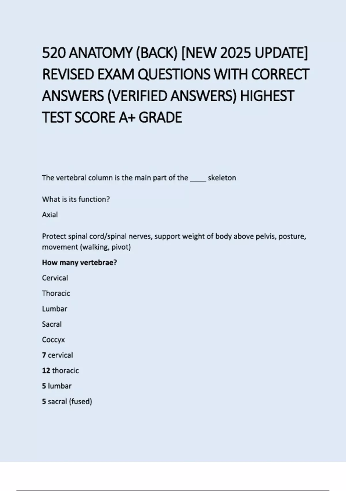 520 ANATOMY (BACK) -NEW 2025 UPDATE- REVISED EXAM QUESTIONS WITH CORRECT ANSWERS