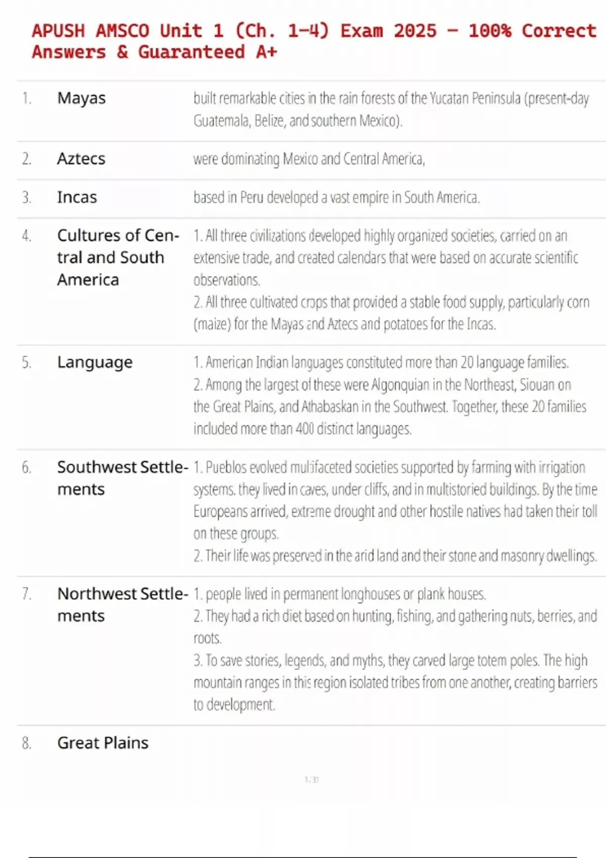 APUSH AMSCO Unit 1 (Ch. 1–4) Exam 2025 – 100% Correct Answers & Guaranteed A+