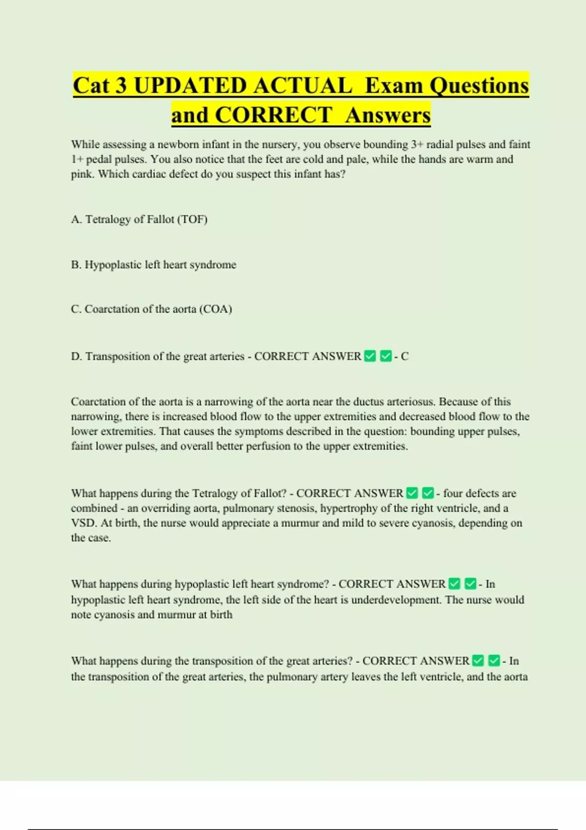 Cat 3 UPDATED ACTUAL Exam Questions and CORRECT Answers While assessing a newborn infant in the nursery, you observe bounding 3+ radial pulses and faint 1+ pedal pulses. You also notice that the feet are cold and pale, while the hands are warm and pink. Which cardiac defect do you suspect this infant has? A. Tetralogy of Fallot (TOF) B. Hypoplastic left heart syndrome C. Coarctation of the aorta (COA) D. Transposition of the great arteries - CORRECT ANSWER - C