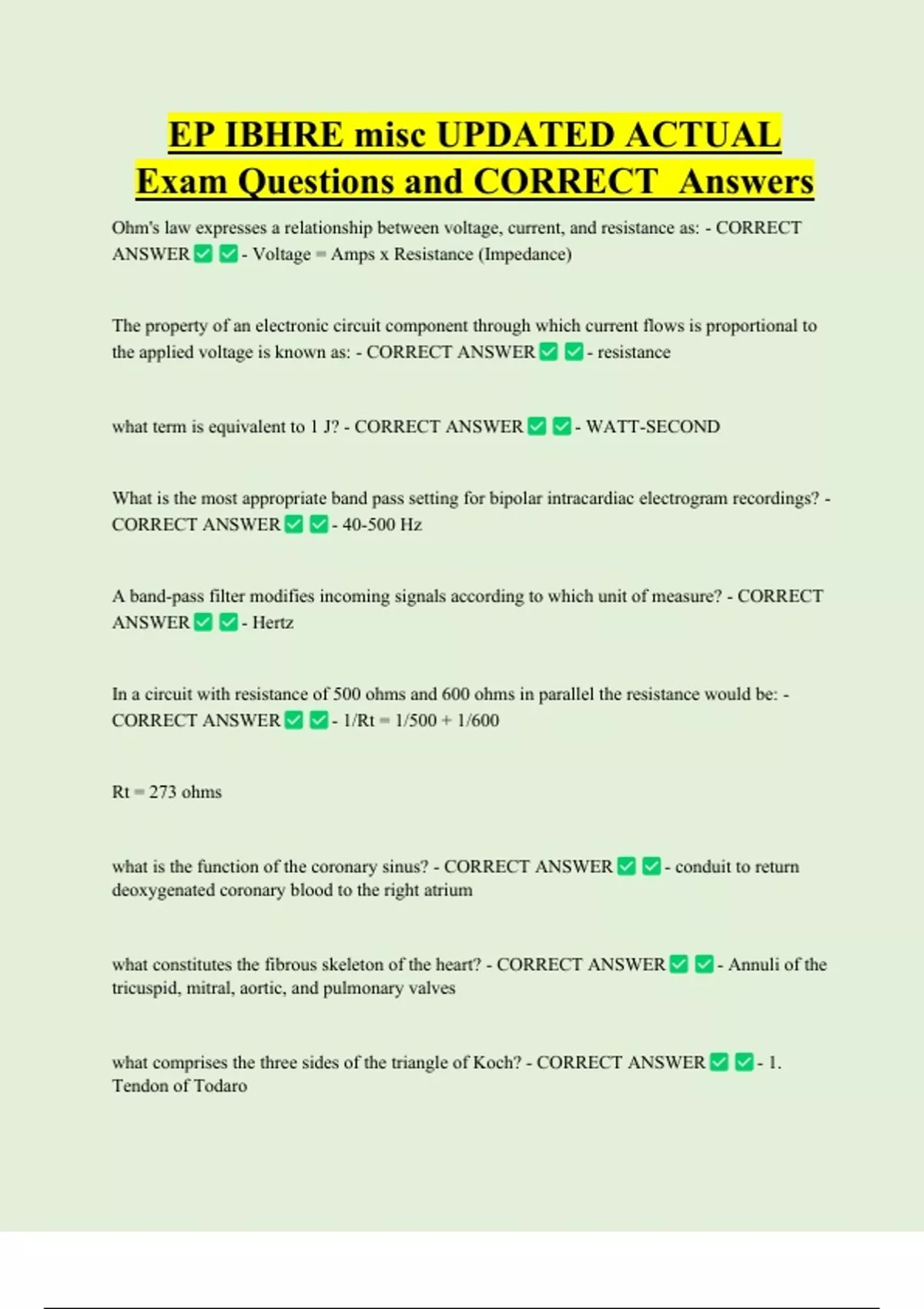 EP IBHRE misc UPDATED ACTUAL Exam Questions and CORRECT Answers Ohm's law expresses a relationship between voltage, current, and resistance as: - CORRECT ANSWER - Voltage = Amps x Resistance (Impedance) The property of an electronic circuit component through which current flows is proportional to the applied voltage is known as: - CORRECT ANSWER - resistance what term is equivalent to 1 J? - CORRECT ANSWER - WATT-SECOND What is the most appropriate band pass setting for bipolar intracardiac electrogram recordings? - CORRECT ANSWER - 40-500 Hz