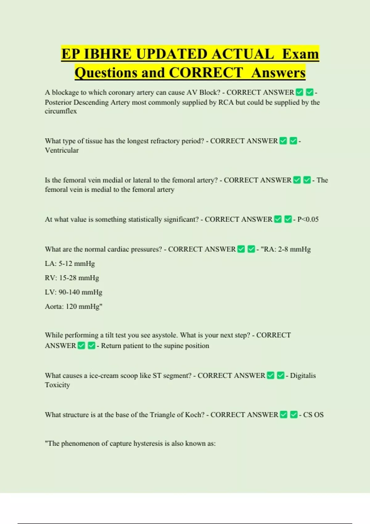 EP IBHRE UPDATED ACTUAL Exam Questions and CORRECT Answers A blockage to which coronary artery can cause AV Block? - CORRECT ANSWER - Posterior Descending Artery most commonly supplied by RCA but could be supplied by the circumflex What type of tissue has the longest refractory period? - CORRECT ANSWER Ventricular Is the femoral vein medial or lateral to the femoral artery? - CORRECT ANSWER femoral vein is medial to the femoral artery At what value is something statistically significant? - CORRECT ANSWER - - The - P<0.05