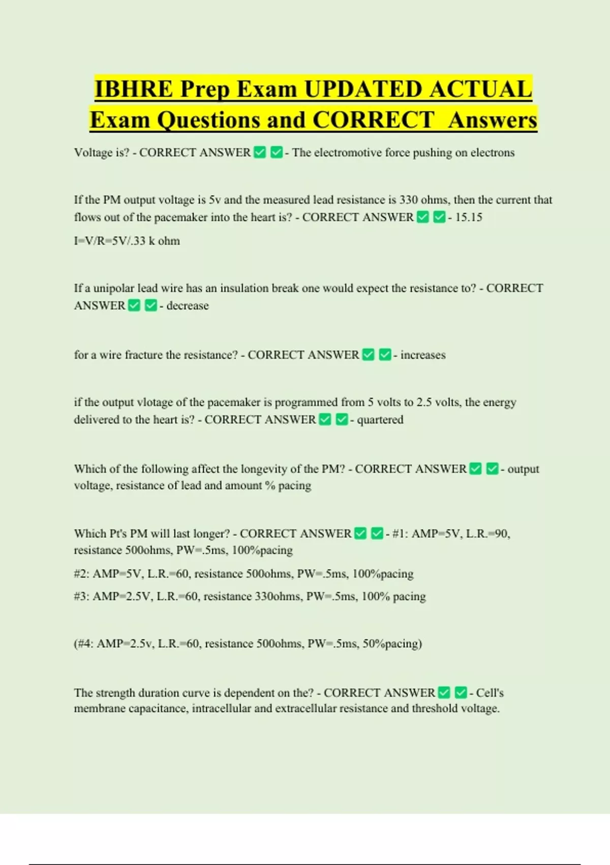 IBHRE Prep Exam UPDATED ACTUAL Exam Questions and CORRECT Answers Voltage is? - CORRECT ANSWER - The electromotive force pushing on electrons If the PM output voltage is 5v and the measured lead resistance is 330 ohms, then the current that flows out of the pacemaker into the heart is? - CORRECT ANSWER - 15.15 I=V/R=5V/.33 k ohm If a unipolar lead wire has an insulation break one would expect the resistance to? - CORRECT ANSWER - decrease for a wire fracture the resistance? - CORRECT ANSWER - increase