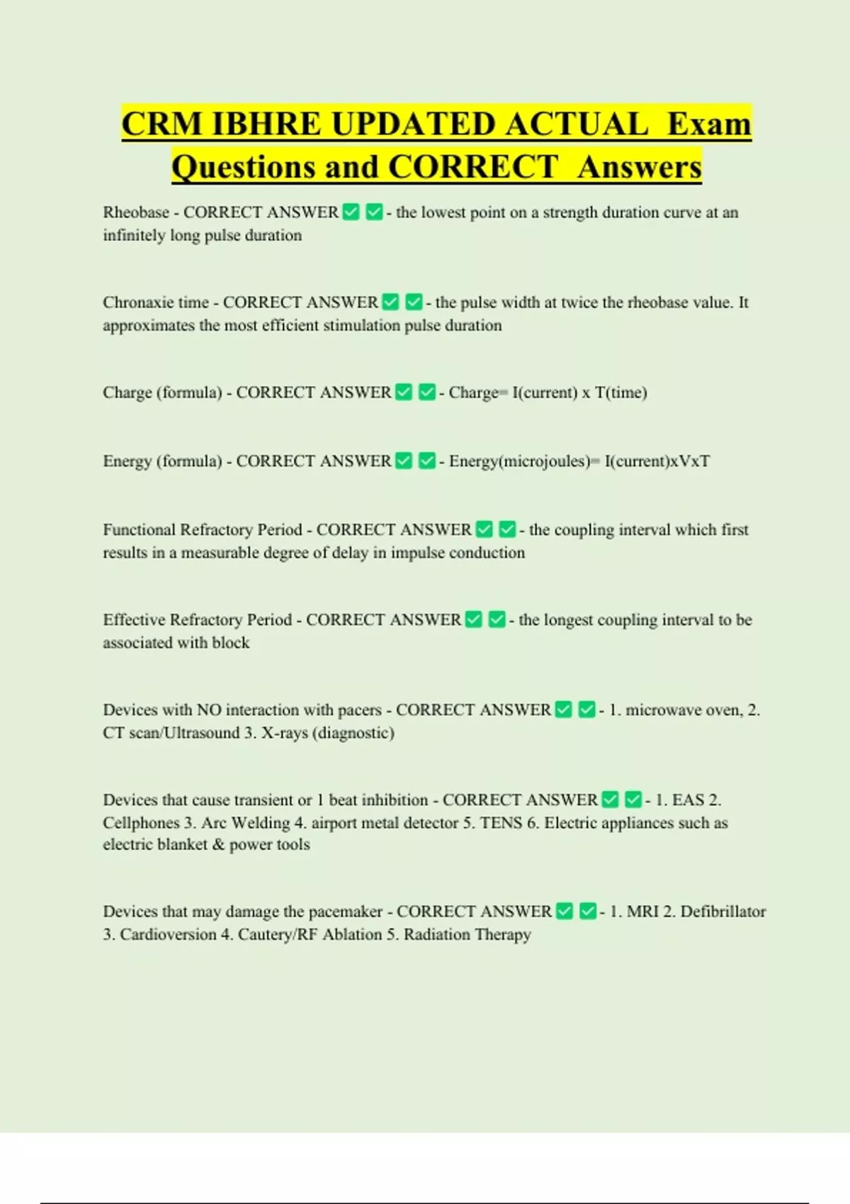CRM IBHRE UPDATED ACTUAL Exam Questions and CORRECT Answers Rheobase - CORRECT ANSWER infinitely long pulse duration Chronaxie time - CORRECT ANSWER - the lowest point on a strength duration curve at an - the pulse width at twice the rheobase value. It approximates the most efficient stimulation pulse duration Charge (formula) - CORRECT ANSWER Energy (formula) - CORRECT ANSWER - Charge= I(current) x T(time) - Energy(microjoules)= I(current)xVxT