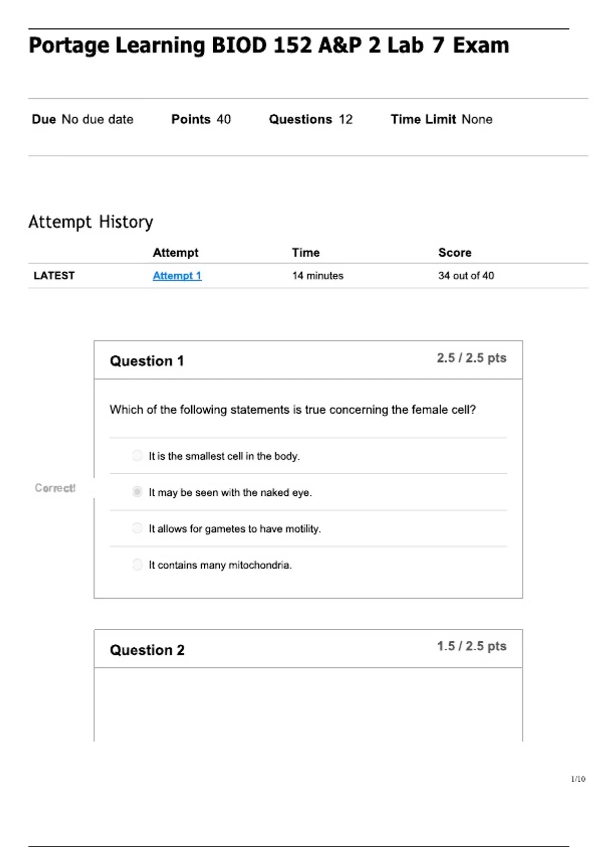 Portage Learning BIOD 152 A&P 2 Lab 7 ExamQuestions & answers