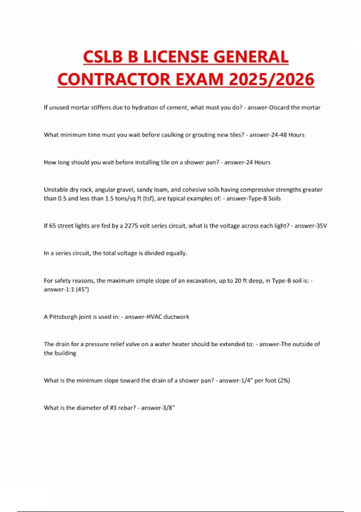 CSLB B LICENSE GENERAL CONTRACTOR EXAM 2025/2026 If unused mortar stiffens due to hydration of cement, what must you do? - answer-Discard the mortar What minimum time must you wait before caulking or grouting new tiles? - answer-24-48 Hours How long should you wait before installing tile on a shower pan? - answer-24 Hours Unstable dry rock, angular gravel, sandy loam, and cohesive soils having compressive strengths greater than 0.5 and less than 1.5 tons/sq ft (tsf), are typical examples of: - answer-Type-B Soils If 65 street lights are fed by a 2275 volt series circuit, what is the voltage across each light? - answer-35V In a series circuit, the total voltage is divided equally. For safety reasons, the maximum simple slope of an excavation, up to 20 ft deep, in Type-B soil is: - answer-1:1 (45°) A Pittsburgh joint is used in: - answer-HVAC ductwork The drain for a pressure relief valve on a water heater should be extended to: - answer-The outside of the building What is the minimum slope toward the drain of a shower pan? - answer-1/4" per foot (2%)