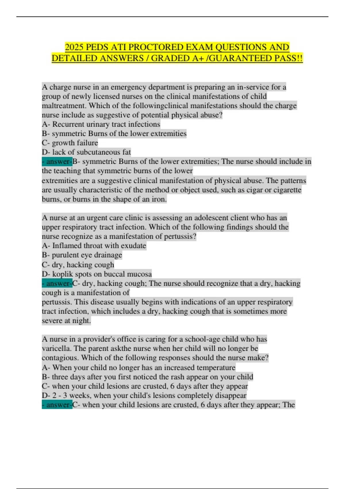 Ace Your 2025 PEDS ATI Proctored Exam with Confidence! What’s Inside? 100% Verified questions and detailed rationales from the latest 2025 ATI Pediatrics Proctored Exam. Graded A+ material, curated by top nursing students and educators. Guaranteed Pass with high-yield content covering child maltreatment, pertussis, varicella, dehydration, asthma, cerebral palsy, and MORE! Clinical pearls, prioritization strategies, and NCLEX-style formatting to boost your critical thinking. Why Buy This Document? Save Time – No more sifting through outdated resources. Maximize Scores – Master high-frequency topics like Meningitis, Nephrotic Syndrome, and Diabetes Insipidus. Trusted by Nursing Students – The #1 resource for NURS 406 (Pediatric Nursing) and similar courses nationwide. Perfect For: Nursing students preparing for ATI proctored exams. Last-minute review with bolded key answers and clear explanations. Educators seeking reliable test-prep materials.