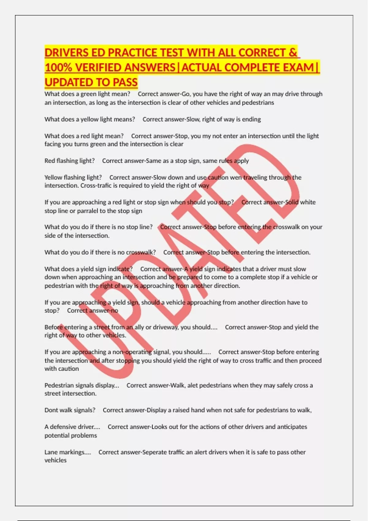 DRIVERS ED PRACTICE TEST WITH ALL CORRECT & 100% VERIFIED ANSWERS|ACTUAL COMPLETE EXAM|UPDATED TO PASS