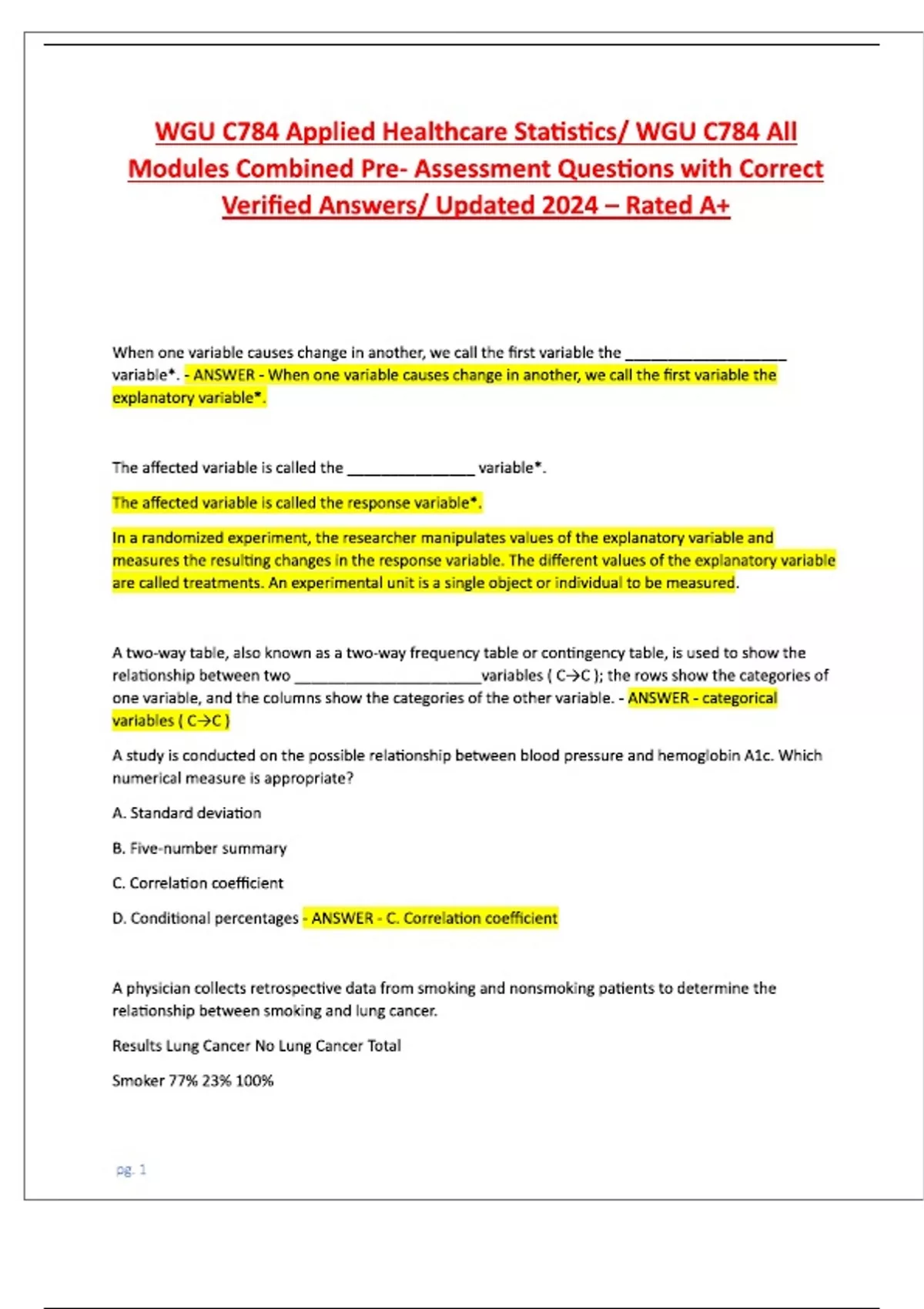 WGU C784 Applied Healthcare Statistics WGU C784 All Modules Combined Pre - Assessment