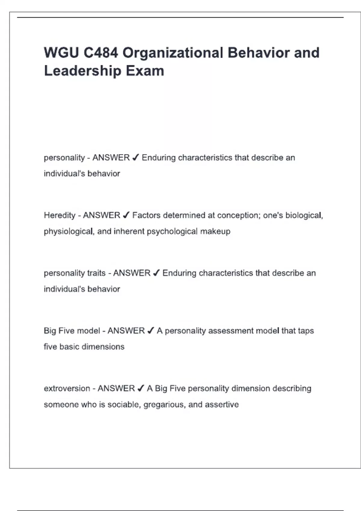 WGU C484 Organizational Behavior and Leadership Exam Questions and Answers
