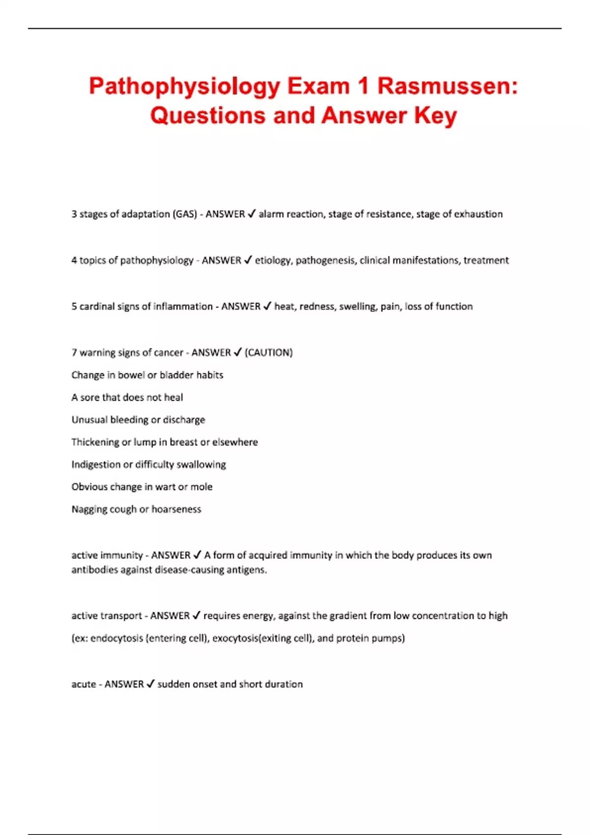 Pathophysiology Exam 1 Rasmussen Questions and Answer Key