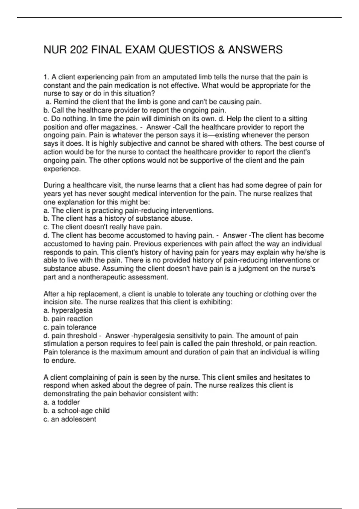 ,d. an older adult - Answer -an adolescent Typical adolescent pain behavior includes