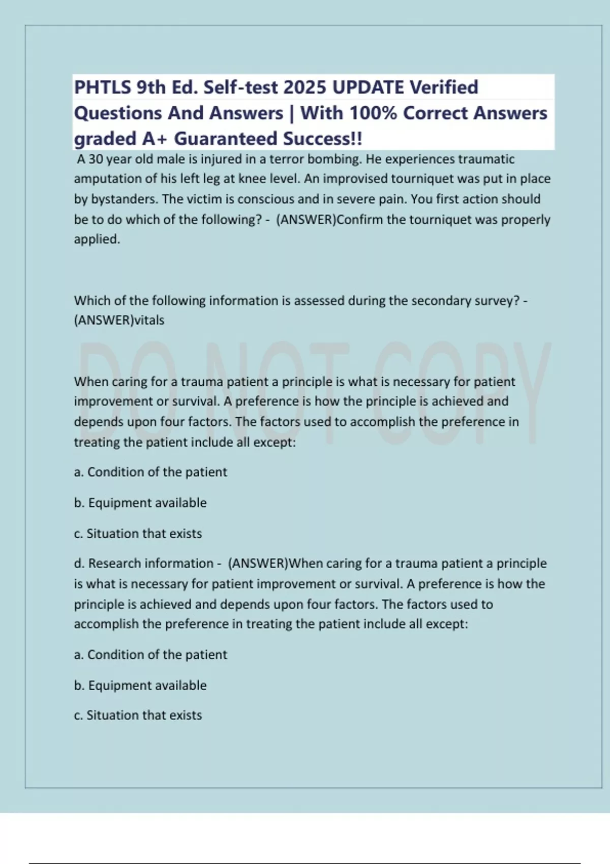 d. Research information - (ANSWER)When caring for a trauma patient a principle