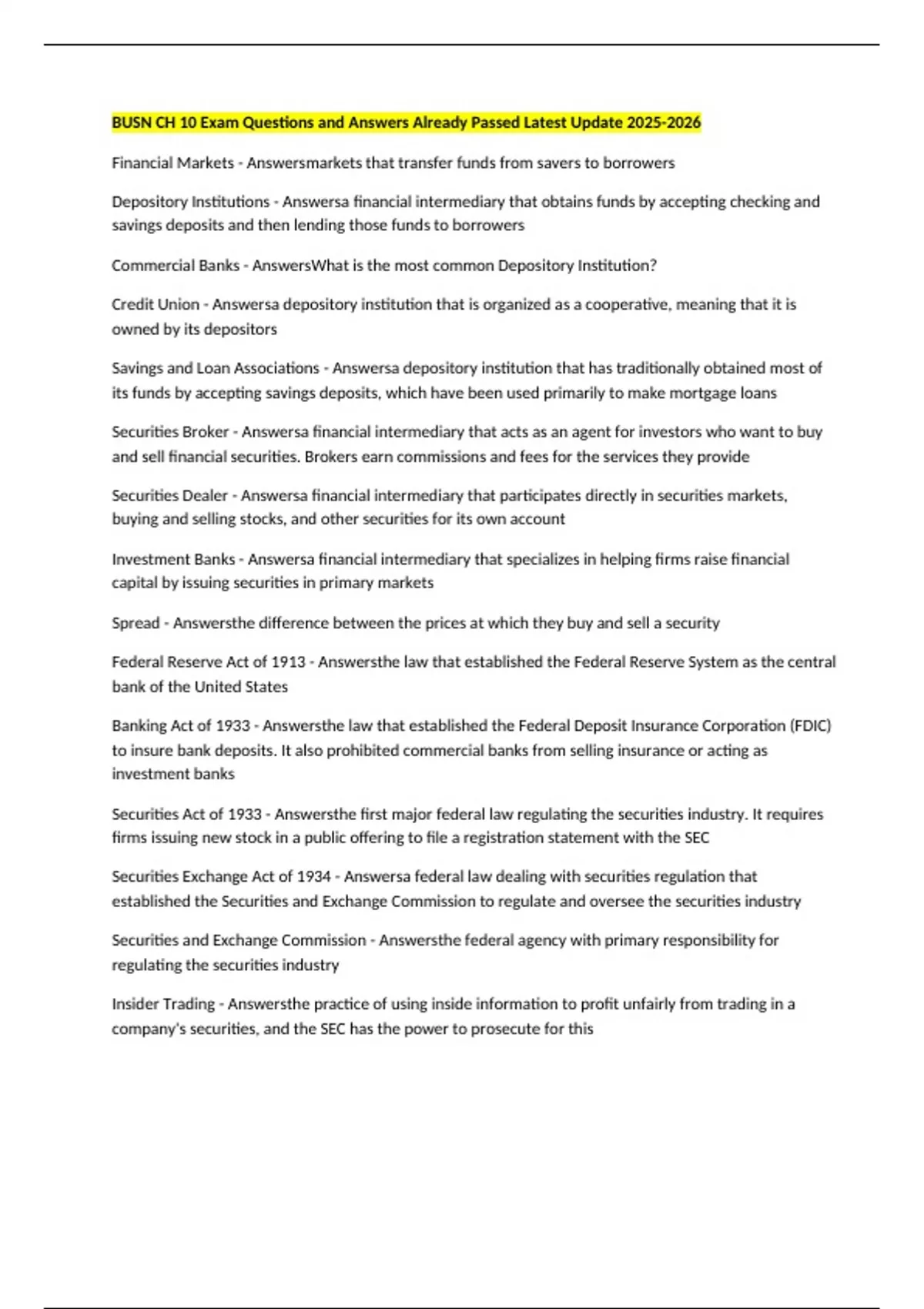 Securities Exchange Act of 1934 - Answersa federal law dealing with securities regulation that