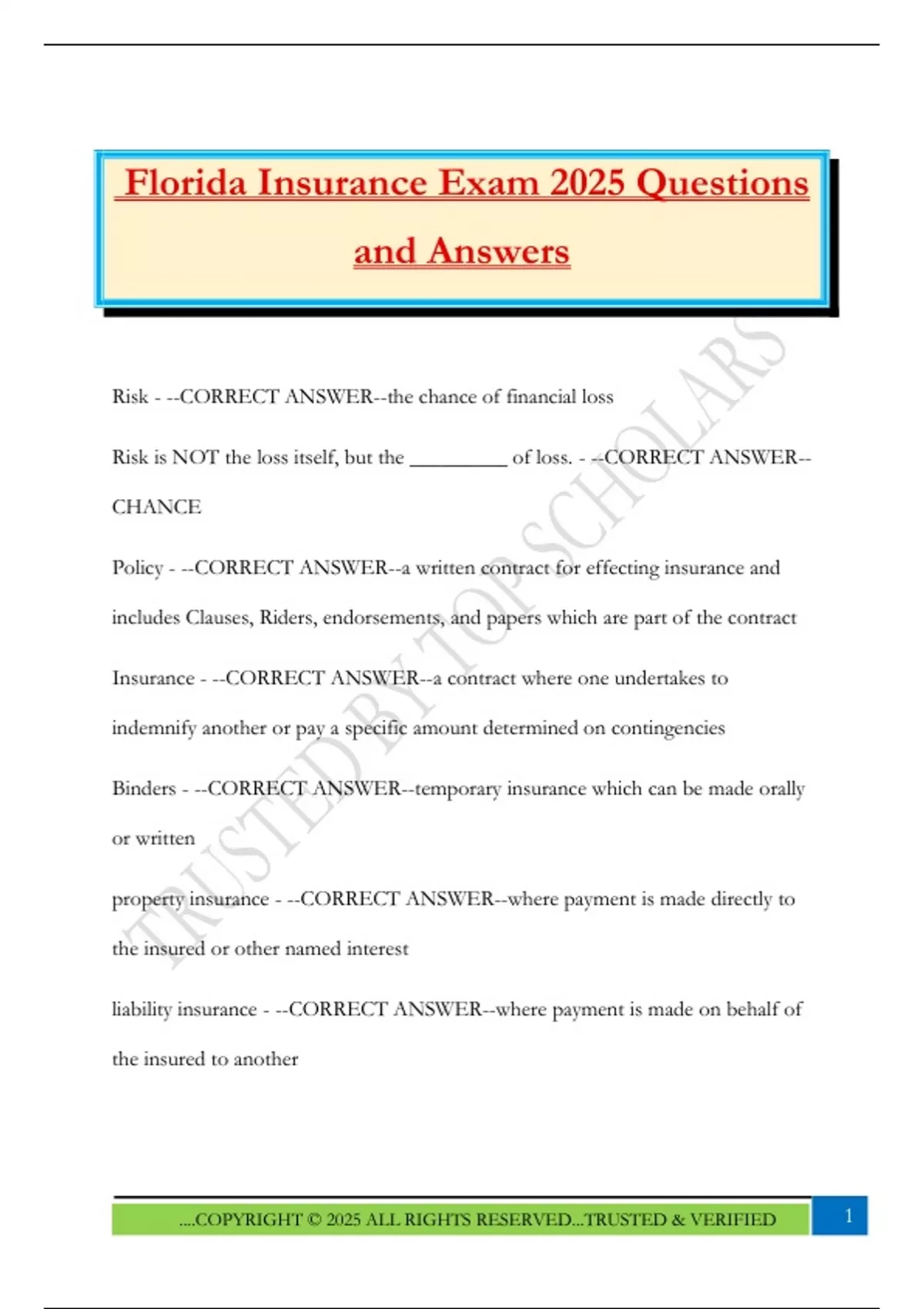 Florida Insurance Exam 2025 Questions and Answers