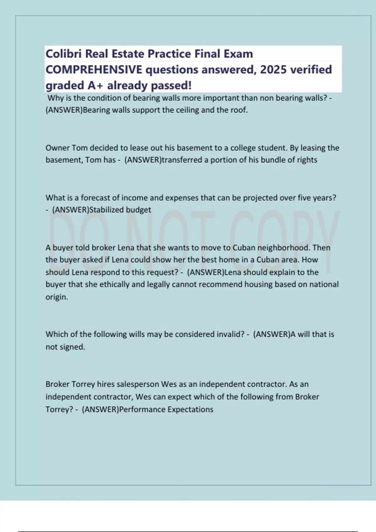 Colibri Real Estate Practice Final Exam COMPREHENSIVE questions answered, 2025 verified graded A+ already passed!