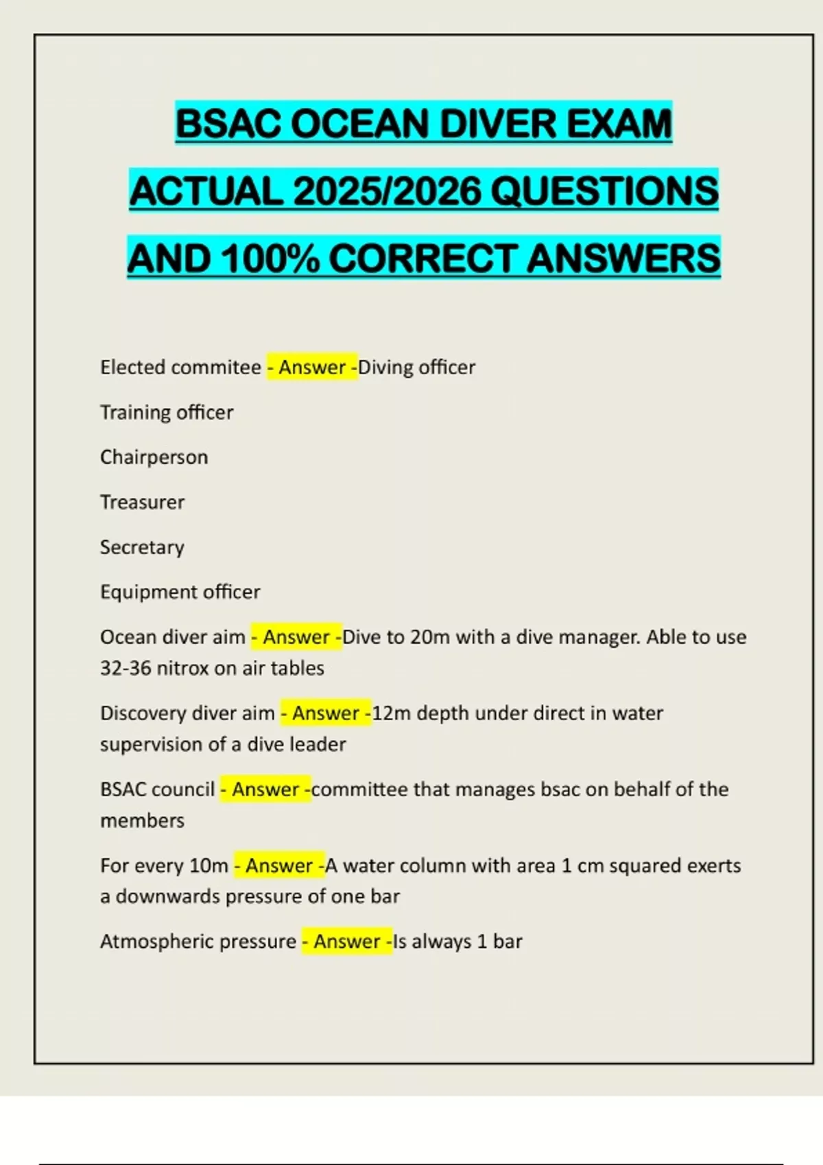 BSAC OCEAN DIVER EXAM ACTUAL 2025/2026 QUESTIONS AND 100% CORRECT ANSWERS Elected commitee - Answer -Diving officer Training officer Chairperson Treasurer Secretary Equipment officer Ocean diver aim - Answer -Dive to 20m with a dive manager. Able to use 32-36 nitrox on air tables Discovery diver aim - Answer -12m depth under direct in water supervision of a dive leader BSAC council - Answer -committee that manages bsac on behalf of the members For every 10m - Answer -A water column with area 1 cm squared exerts a downwards pressure of one bar Atmospheric pressure - Answer -Is always 1 barHow to measure water pressure - Answer -Depth gauges, given in metres 10m the air volume is - Answer -2 bar pressure 20m the air volume is - Answer -3 bar pressure 30m the air volume is - Answer -4 bar pressure Body water content - Answer -80 per cent Mask - Answer -Rigid mask frame Tempered glass Flexible seal of silicione rubber Wash your mask in fresh water after each dive Shoe fin - Answer -Warn weather conditions Strap fin - Answer -Foot pocket Adjustable strap/spring