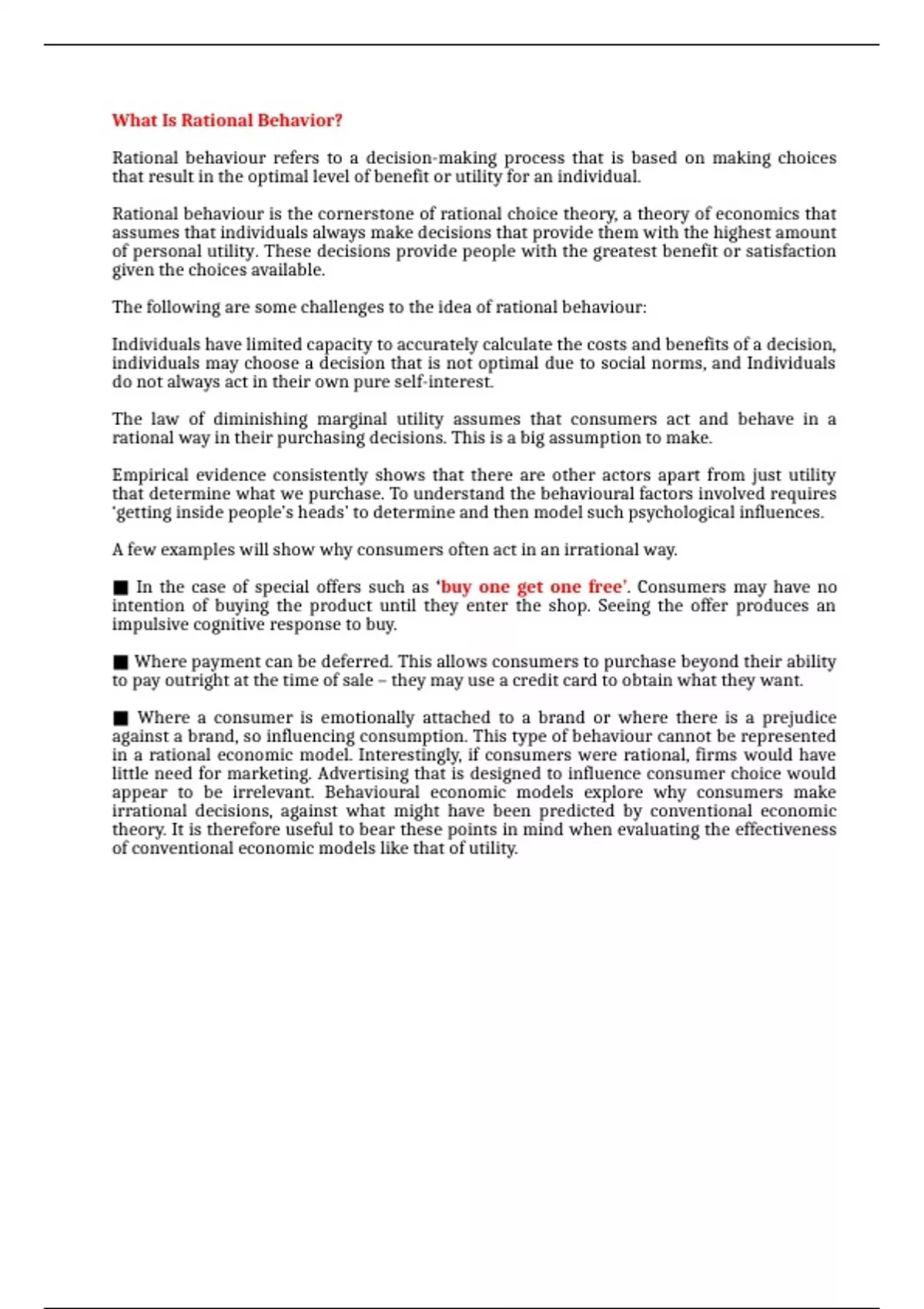 Rational behaviour is the cornerstone of rational choice theory, a theory of economics that