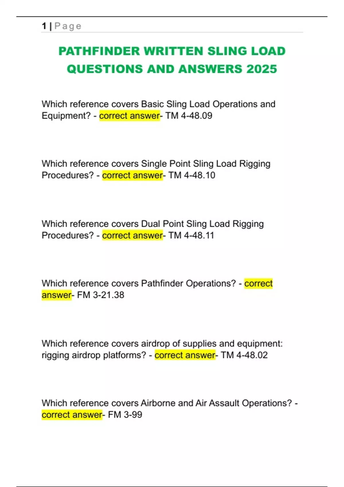 PATHFINDER WRITTEN SLING LOAD QUESTIONS AND ANSWERS 2025