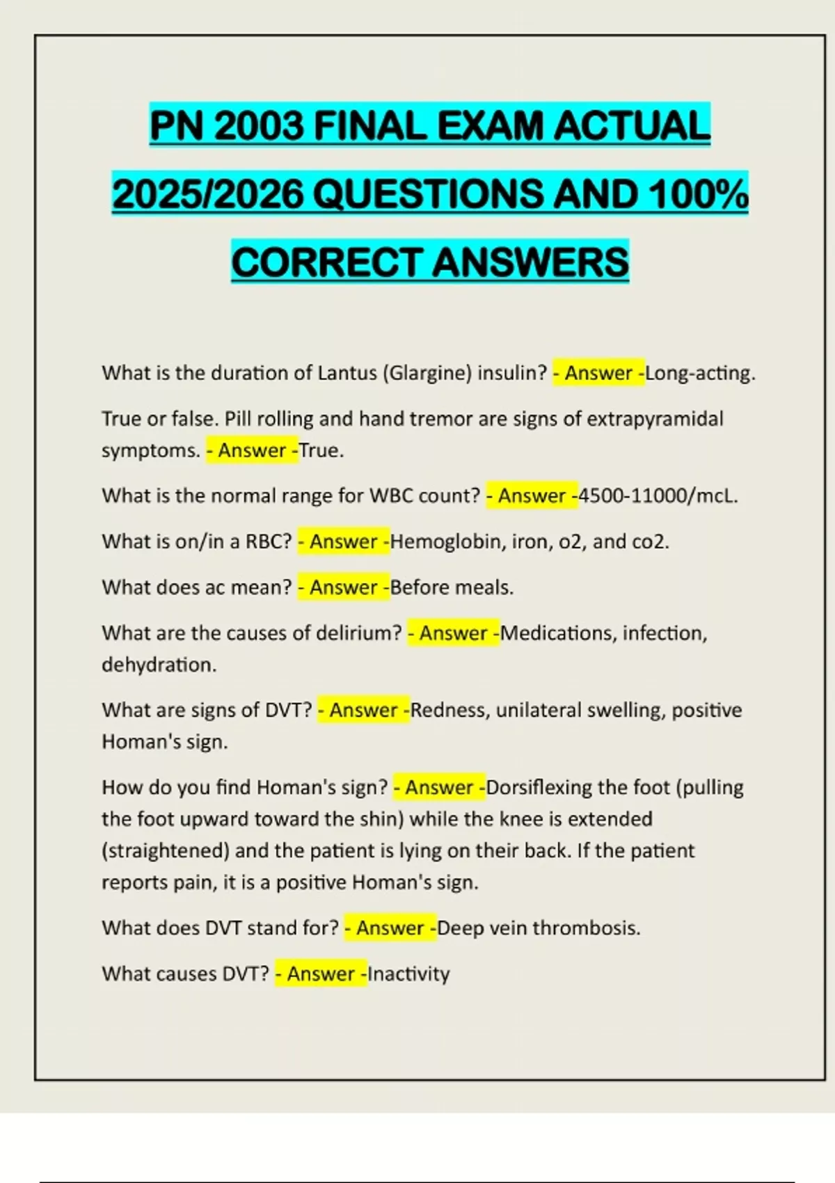 PN 2003 FINAL EXAM ACTUAL 2025/2026 QUESTIONS AND 100% CORRECT ANSWERS What is the duration of Lantus (Glargine) insulin? - Answer -Long-acting. True or false. Pill rolling and hand tremor are signs of extrapyramidal symptoms. - Answer -True. What is the normal range for WBC count? - Answer -/mcL. What is on/in a RBC? - Answer -Hemoglobin, iron, o2, and co2. What does ac mean? - Answer -Before meals. What are the causes of delirium? - Answer -Medications, infection, dehydration. What are signs of DVT? - Answer -Redness, unilateral swelling, positive Homan's sign. How do you find Homan's sign? - Answer -Dorsiflexing the foot (pulling the foot upward toward the shin) while the knee is extended (straightened) and the patient is lying on their back. If the patient reports pain, it is a positive Homan's sign. What does DVT stand for? - Answer -Deep vein thrombosis. What causes DVT? - Answer -InactivityPregnancy Old Age Obesity What are the main S+S of depression in older adults? - Answer -Poor sleep and decrease in short term memory. What is tardive dyskinesia? - Answer -Involuntary facial movements. What type of dementia overlaps with Alzheimer's disease and Parkinson's disease? - Answer -Lewy-Body dementia. What does HbA1c measure? - Answer -The average blood glucose over the last 3 months. What does PCOS stand for? - Answer -Polycystic ovarian syndrome. What is the name for structural protrusion? - Answer -Prolapse. What is the name for prolapse? - Answer -Structural protrusion. What is the main sign of cataracts? - Answer -Cloudy lens. What is otitis media? - Answer -Inflammation or infection of the middle ear.