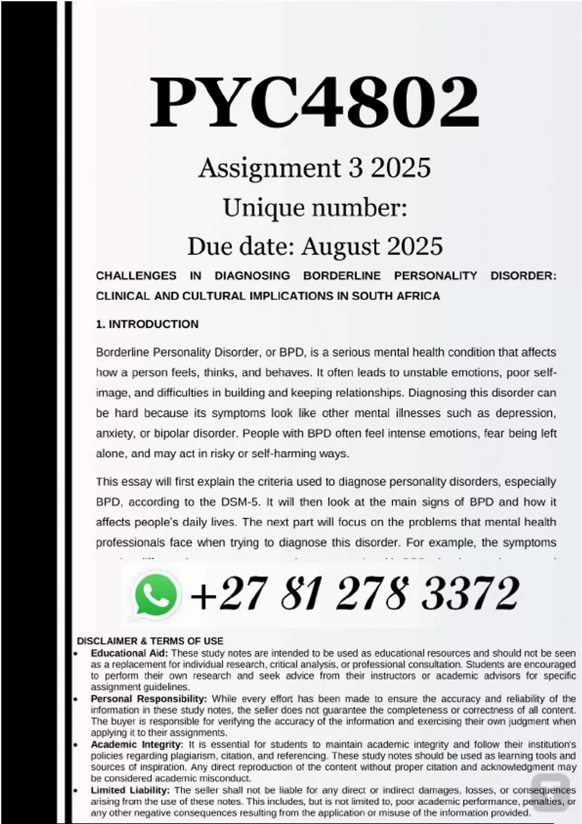 PYC4802 Assignment 3 (COMPLETE ANSWERS) 2025 - DUE August 2025.. . Borderline Personality Disorder, or BPD, is a serious mental health condition that affects how a person feels, thinks, and behaves. It often leads to unstable emotions, poor self-image, and difficulties in building and keeping relationships. Diagnosing this disorder can be hard because its symptoms look like other mental illnesses such as depression, anxiety, or bipolar disorder. People with BPD often feel intense emotions, fear being left alone, and may act in risky or self-harming ways. This essay will first explain the criteria used to diagnose personality disorders, especially BPD, according to the DSM-5. It will then look at the main signs of BPD and how it affects people’s daily lives. The next part will focus on the problems that mental health professionals face when trying to diagnose this disorder. For example, the symptoms can be different in every person, and many people with BPD also have other mental health issues, making diagnosis more confusing. Finally, this essay will explore how these challenges play out in the South African context. In South Africa, there are extra difficulties like lack of mental health services, cultural misunderstandings, and stigma. These factors make it even harder to diagnose and treat BPD properly in the country (Burke et al., 2019). ...... Discuss the challenges that are experienced by clinicians when assessing and diagnosing borderline personality disorder and their applicability within the South African context. (100 marks) a) Discuss the diagnostic criteria and hallmark features of Personality disorder and Borderline Personality Disorder (20) b) Critically discuss challenges that are experienced by clinicians in identifying and diagnosing BPD and examine the relevance within the South African context (60) c) Layout of the essay and using the correct APA referencing style, and for additional use of students’ references (20) Introduction (5) Discuss the DSM-5 diagnostic criteria for Personality and borderline personality disorder. (15) Linking the question with specific diagnostic criteria for borderline personality disorder. (10) Discuss the problems experienced by clinicians related to identifying and diagnosing borderline personality disorder. (30) Contextual factors of South Africa emphasized (10) Evidence of having thoroughly incorporated the prescribed articles on cultural factors in the argument