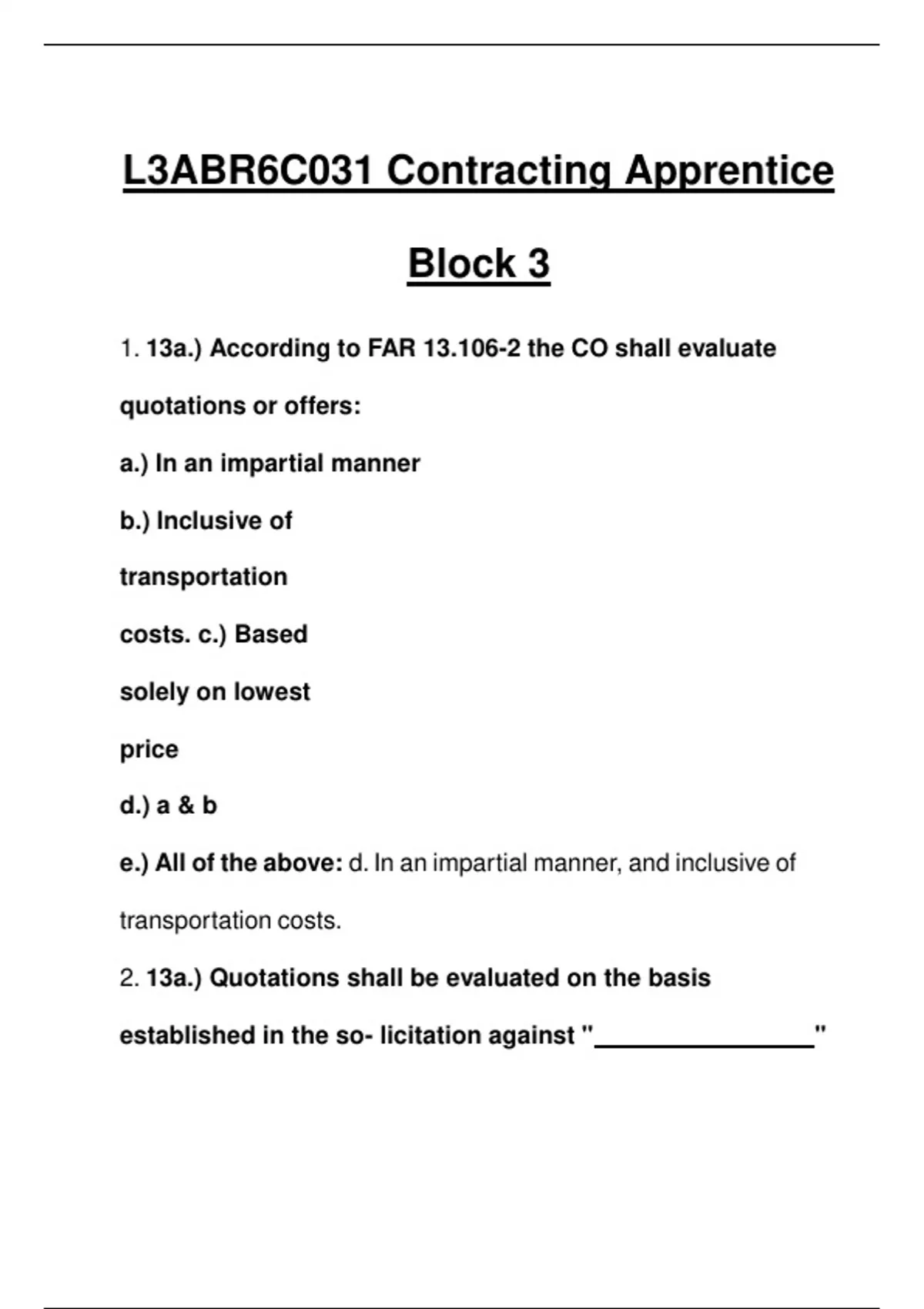 1. 13a.) According to FAR 13.106-2 the CO shall evaluate