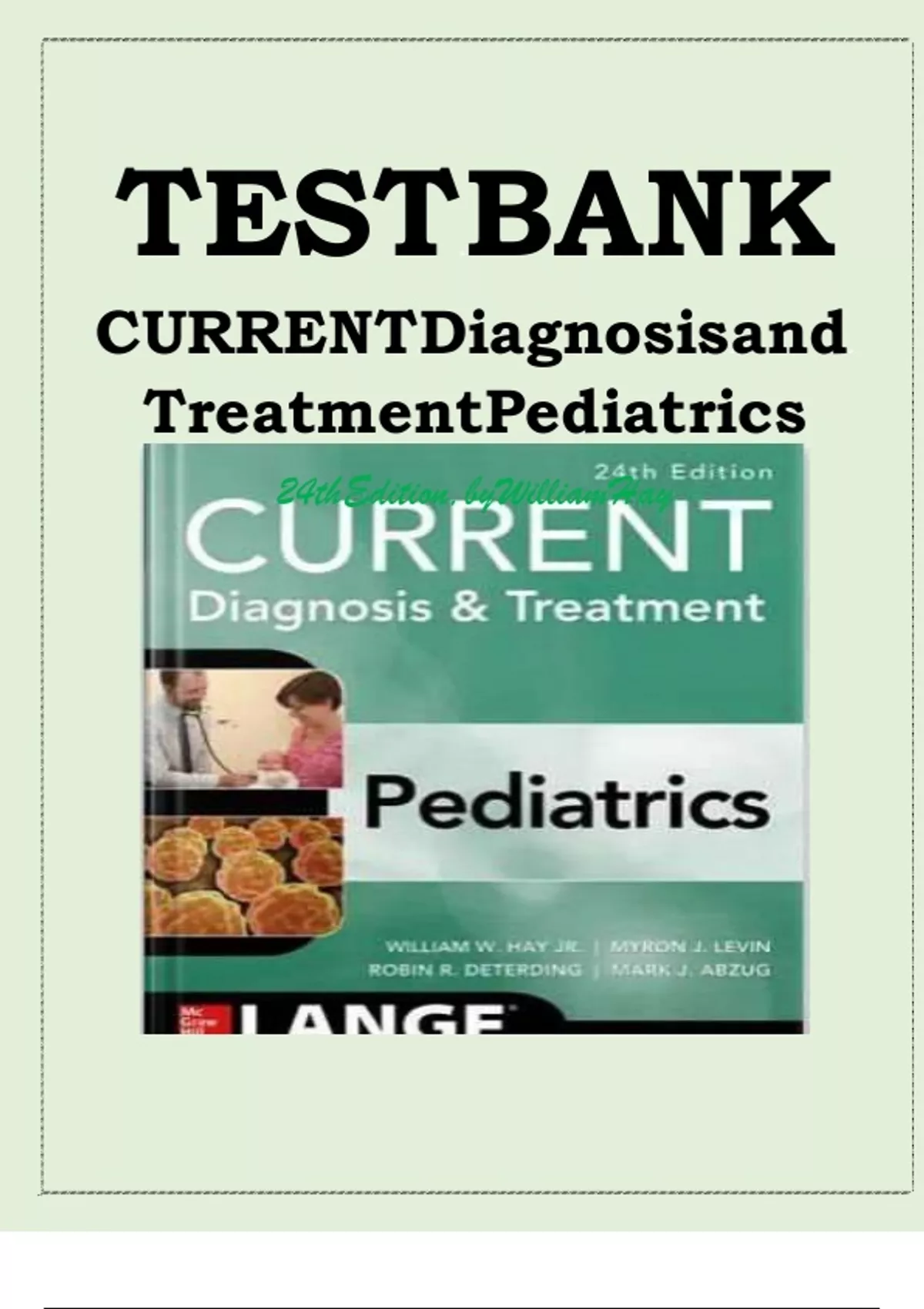 Get instant access to the Test Bank for Current Diagnosis & Treatment Pediatrics, 24th Edition by William W. Hay. This comprehensive resource includes multiple-choice questions, answers, and rationales covering all chapters, from newborn care to adolescent health. Perfect for medical students, nursing professionals, and educators, this test bank aids in exam preparation and reinforces key pediatric concepts. Download now to enhance your study and teaching materials!