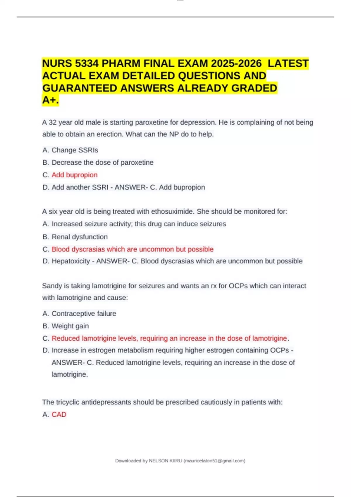 NURS 5334 PHARM FINAL EXAM LATEST ACTUAL EXAM DETAILED QUESTIONS AND GUARANTEED ANSWERS ALREADY GRADED A+. A 32 year old male is starting paroxetine for depression. He is complaining of not being able to obtain an erection. What can the NP do to help. A. Change SSRIs B. Decrease the dose of paroxetine C. Add bupropion D. Add another SSRI - ANSWER- C. Add bupropion A six year old is being treated with ethosuximide. She should be monitored for: A. Increased seizure activity; this drug can induce seizures B. Renal dysfunction C. Blood dyscrasias which are uncommon but possible D. Hepatoxicity - ANSWER- C. Blood dyscrasias which are uncommon but possible