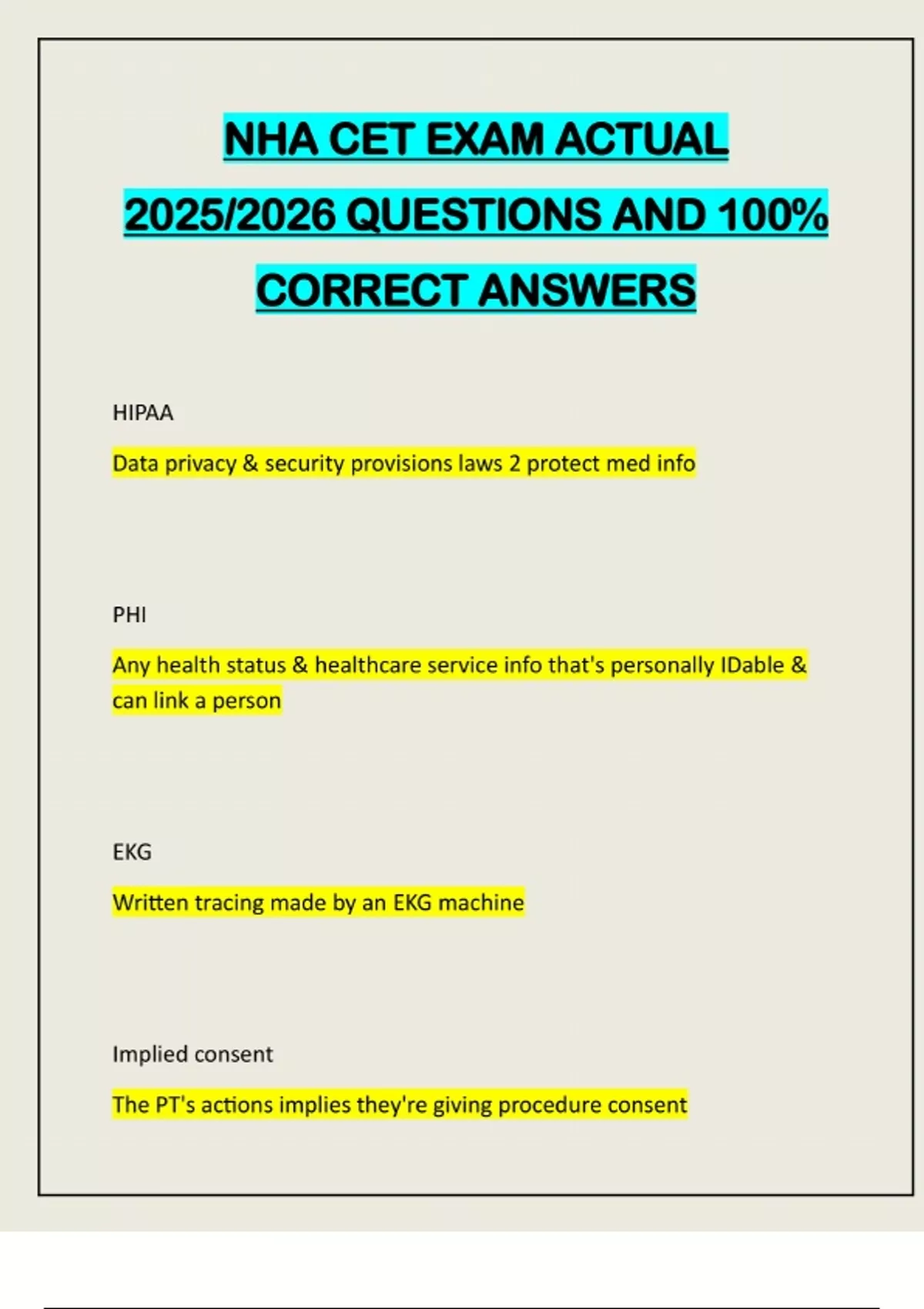 NHA CET EXAM ACTUAL 2025/2026 QUESTIONS AND 100% CORRECT ANSWERS HIPAA Data privacy & security provisions laws 2 protect med info PHI Any health status & healthcare service info that's personally IDable & can link a person EKG Written tracing made by an EKG machine Implied consent The PT's actions implies they're giving procedure consentHolter monitor Portable battery-operated device that continuously monitors ♡ activity ≥24hr; AKA ambulatory monitor Event recorder Outpatient cardiac test involving PT triggering the machine 2 record when having symptoms Med asepsis Practice designed 2 ↓ pathogen transfer & break the infection chain Standard precautions Basic level infection-control practices healthcare workers must do b4, during, & after every PT encounter 2 prevent infection spreadHAI Infection from the healthcare workers/setting PPE Protective clothes & equipment (gloves, mask, gown, goggles) that protect a worker from chem/infectious material exposure Leads Wires that conduct electrical impulses from electrodes 2 an EKG machine EKG machine Instrument that gives the ♡'s electrical activity a graphic rep SDS Manufacturer's documentation of potentially harmful substances listing the chem parts, associat