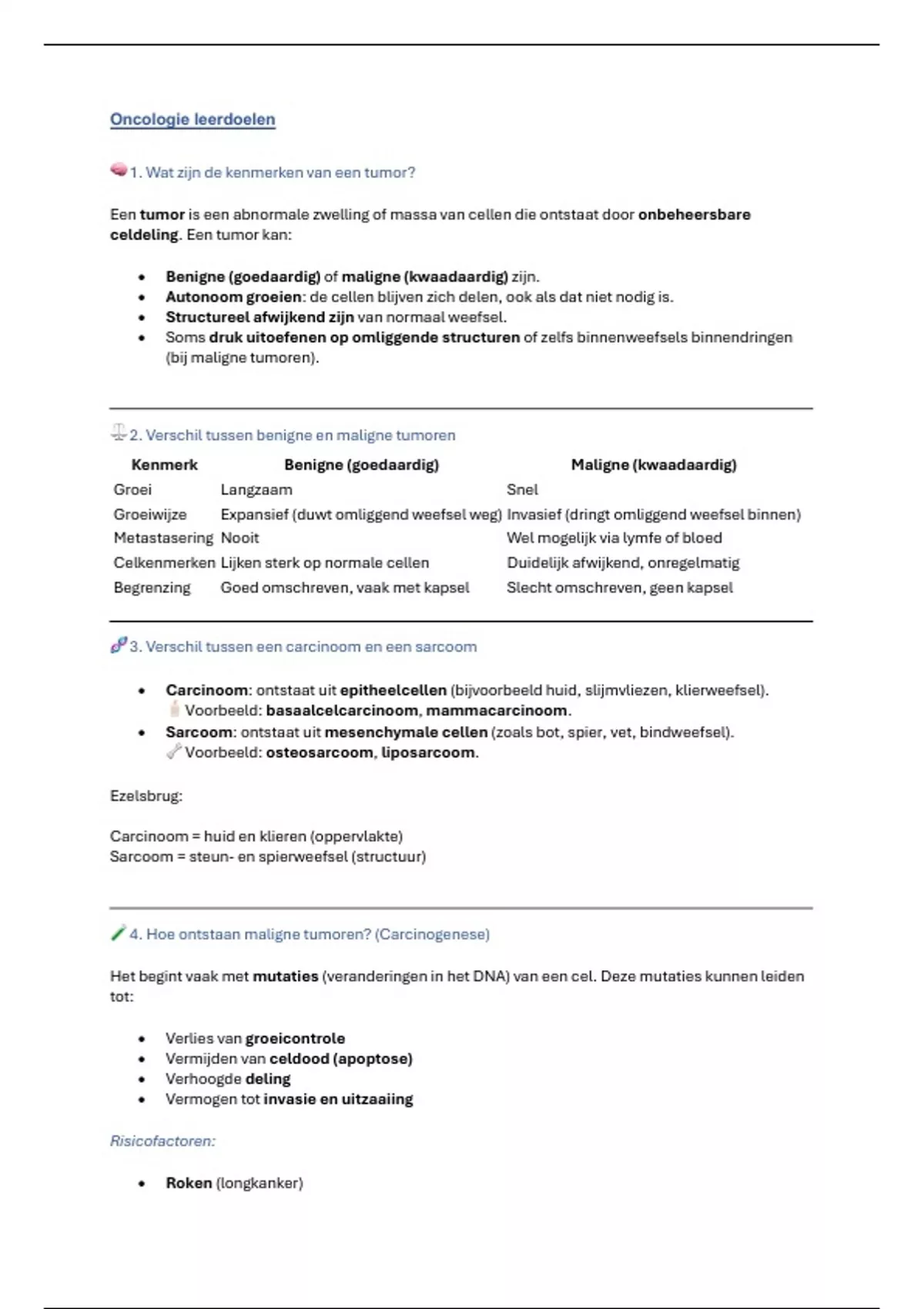 • Carcinoom: ontstaat uit epitheelcellen (bijvoorbeeld huid, slijmvliezen, klierweefsel).