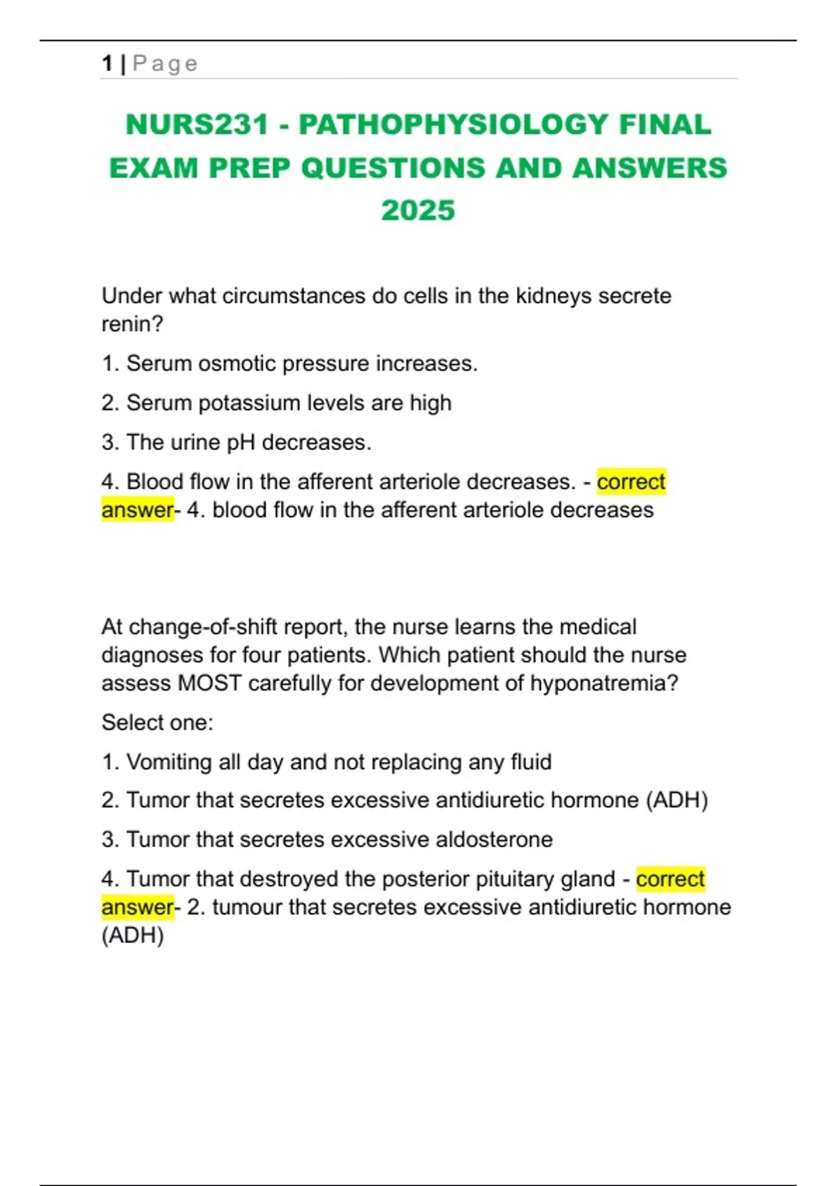 NURS231 - PATHOPHYSIOLOGY FINAL