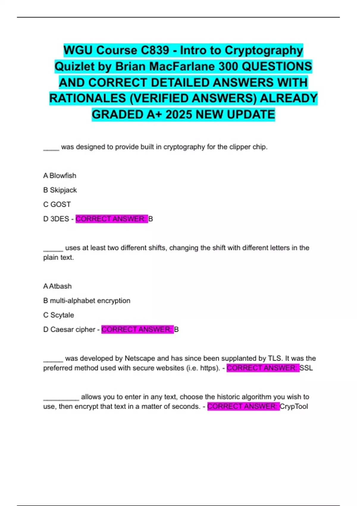 WGU Course C839 - Intro to Cryptography Quizlet by Brian MacFarlane 300 QUESTIONS AND CORRECT DETAILED ANSWERS WITH RATIONALES (VERIFIED ANSWERS) ALREADY GRADED A+ 2025 NEW UPDATE