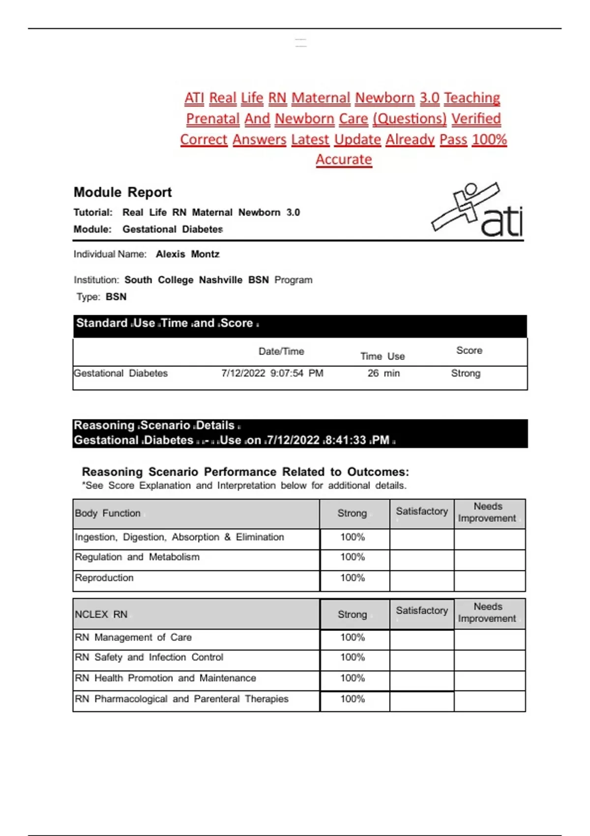 ATI Real Life RN Maternal Newborn 3.0 Teaching