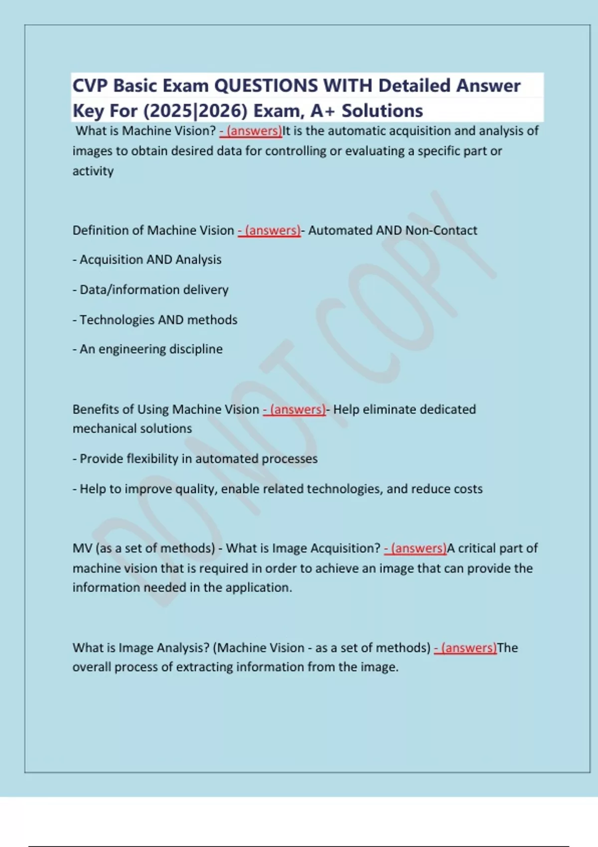 Definition of Machine Vision - (answers)- Automated AND Non‐Contact