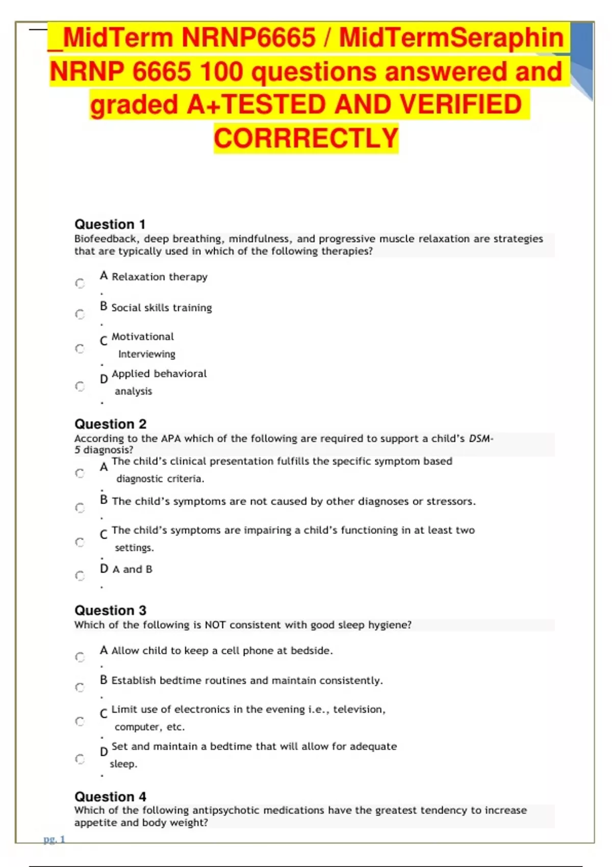 This document contains the full NRNP 6665 Midterm Exam (Seraphin version), featuring 100 thoroughly reviewed and verified questions with correct answers. It covers core psychiatric mental health nurse practitioner topics including diagnosis, treatment planning, pharmacologic interventions, and evidence-based care. Graded A+, ideal for focused study and preparation.