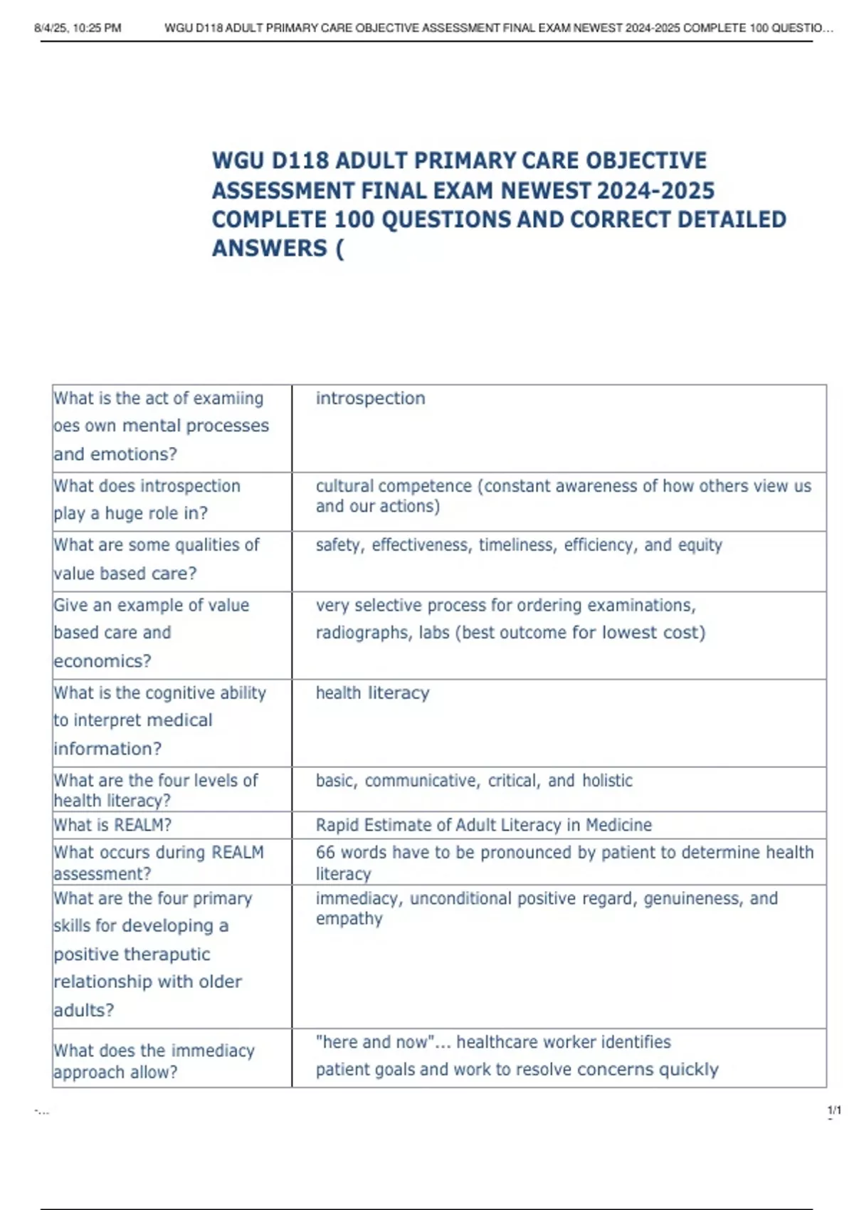 8/4/25, 10:25 PM WGU D118 ADULT PRIMARY CARE OBJECTIVE ASSESSMENT FINAL EXAM NEWEST 2024-2025 COMPLETE 100 QUESTIO…