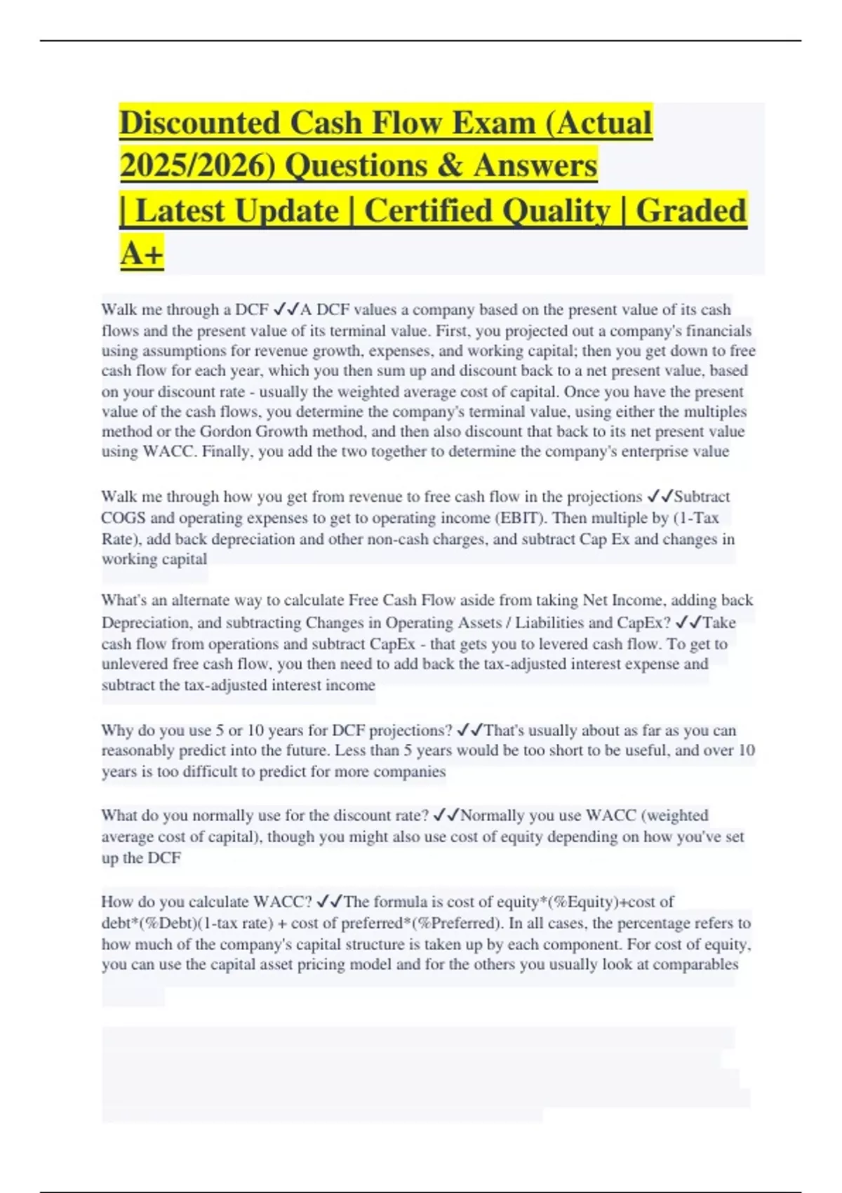 Discounted Cash Flow Exam (Actual 2025/2026) Questions & Answers | Latest Update | Certified Quality | Graded A+ Walk me through a DCF A DCF values a company based on the present value of its cash flows and the present value of its terminal value. First, you projected out a company's financials using assumptions for revenue growth, expenses, and working capital; then you get down to free cash flow for each year, which you then sum up and discount back to a net present value, based on your discount rate - usually the weighted average cost of capital. Once you have the present value of the cash flows, you determine the company's terminal value, using either the multiples method or the Gordon Growth method, and then also discount that back to its net present value using WACC. Finally, you add the two together to determine the company's enterprise value Walk me through how you get from revenue to free cash flow in the projections Subtract COGS and operating expenses to get to operating income (EBIT). Then multiple by (1-Tax Rate), add back depreciation and other non-cash charges, and subtract Cap Ex and changes in working capital What's an alternate way to calculate Free Cash Flow aside from taking Net Income, adding back Depreciation, and subtracting Changes in Operating Assets / Liabilities and CapEx? Take cash flow from operations and subtract CapEx - that gets you to levered cash flow. To get to unlevered free cash flow, you then need to add back the tax-adjusted interest expense and subtract the tax-adjusted interest income