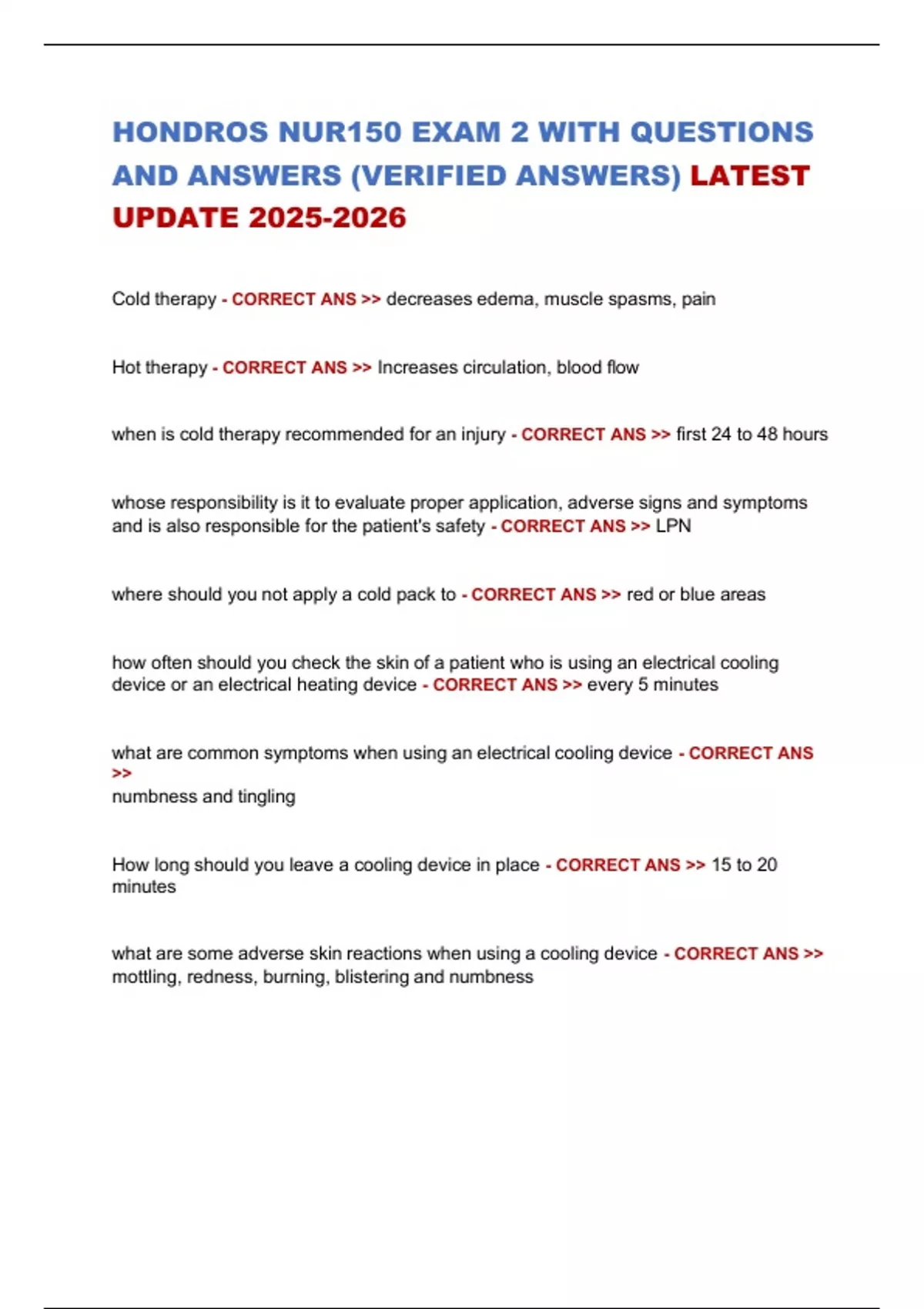 HONDROS NUR150 EXAM 2 WITH QUESTIONS AND ANSWERS (VERIFIED ANSWERS) LATEST UPDATE Cold therapy - CORRECT ANS decreases edema, muscle spasms, pain Hot therapy - CORRECT ANS Increases circulation, blood flow when is cold therapy recommended for an injury - CORRECT ANS first 24 to 48 hours whose responsibility is it to evaluate proper application, adverse signs and symptoms and is also responsible for the patient's safety - CORRECT ANS LPN where should you not apply a cold pack to - CORRECT ANS red or blue areas how often should you check the skin of a patient who is using an electrical cooling device or an electrical heating device - CORRECT ANS every 5 minutes what are common symptoms when using an electrical cooling device - CORRECT ANS numbness and tingling How long should you leave a cooling device in place - CORRECT ANS 15 to 20 minutes what are some adverse skin reactions when using a cooling device - CORRECT ANS mottling, redness, burning, blistering and numbness what should you record when using a cooling device or heating device - CORRECT ANS what device you used, location, duration, patient response, patient teaching and patients response to teaching when should you immediately stop application of a cooling device - CORRECT ANS areas become mottled, red or blue/purple, or if the patient Is complaining of pain/numbness when should you immediately stop application of a heating device - CORRECT ANS skin becomes reddened and sensitive to touch, extreme warmth noted at the area, and body part becomes painful to move How long should you leave the heating device in place - CORRECT ANS 20 to 30 minutes or as prescribed whose responsibility is it to assess skin areas prior to applications of heating and cooling device and assess for risks - CORRECT ANS LPN what is one of the nurse's highest priority of care - CORRECT ANS prevention and treatment of skin impairment how often should you reposition a chair bound patient - CORRECT ANS every hour how often should you reposition a patient that is bed bound - CORRECT ANS every 2 hours at a 30 degree angle whose responsibility is it to properly collect a culture of the pressure ulcer - CORRECT ANS nurse how do you properly label a specimen - CORRECT ANS patients name, medical record number, date of birth, date and time of collection, what the collection is for, your name and initials. send as quickly as possible to the lab what are anaerobic collections of - CORRECT ANS inside of body cavities what are aerobic collections of - CORRECT ANS wound secretions What occurs when the tissue layers of skin slide on each other , causing subcutaneous blood vessels to kink or stretch resulting in an interruption of blood flow to the skin - CORRECT ANS shearing force What is the rubbing of skin against another surface produces what - CORRECT ANS friction what are the 2 mechanical factors that play a common role in the development of pressure ulcers - CORRECT ANS shearing force and friction which patients are at risk for pressure ulcers - CORRECT ANS chronically ill, debilitated, older, disabled, or incontinent patients, patients with spinal cord injuries, circulatory impairment or poor overall nutrition how can the nurse assess a patients skin for skin impairment - CORRECT ANS blanching the area Wound Stage 1 - CORRECT ANS over a bony prominence , that is intact with nonblanchable redness. Warm to touch 1hr of sitting Wound Stage 2 - CORRECT ANS partial thickness skin loss w/ serous drainage may present as serum- filled blisters clear 2hr bed bound Wound Stage 3 - CORRECT ANS full tissue thickness loss subcutaneous fat is sometimes visible, but bone, tendon, and muscle are not exposed Wound Stage 4 - CORRECT ANS full thickness loss with exposed bone, tendon, or muscle. sometimes slough or eschar is present on some parts of the wound tunneling which stage of pressure ulcer would put a patient at risk for osteomyelitis - ANSWER : stage 4 pressure ulcer the true depth and stage of this ulcer can not be determined. wound bed is covered by slough this is yellow, tan, gray, green or brown. eschar wound bed is tan, brown or black. - CORRECT ANS unstageable/unclassified the wound appears as a localized purple or maroon area of discolored intact skin or a blood filled blister shiny. painful, firm, mushy, boggy, or warm to cool compared with adjacent tissue. the wound is sometimes covered in thin eschar - CORRECT ANS deep tissue injury interventions for someone with a pressure ulcer - CORRECT ANS nutrition ( protiens and vitamin c), oral intake teachings, repositioning of the patient every 2 hours in a 30 degree lateral-incline position. intact without abrasions, warm and moist, localized changes in texture across surface, good turgor (elastic and firm), generally smooth and soft - CORRECT ANS characteristics of normal skin NEVER COLLECT A WOUND SPECIMEN FROM - CORRECT ANS Old wound drainage If a patient is incontinent applying what will prevent skin breakdown - CORRECT ANS Moisture skin sealant barrier what should sputum not be mixed with during the specimen collection - CORRECT ANS saliva What test is used to determine infection - CORRECT ANS C&S should you have the patient drink extra fluids the night before collecting a sputum collection - CORRECT ANS yes should a wound culture sample be collected from old drainage - CORRECT ANS NO what are the 6 classes of essential nutrients - CORRECT ANS carbs, fats, proteins, vitamins, minerals and water which nutrients play an important role in building and tissue repair - CORRECT ANS proteins, fat and vitamin c what does dietary fiber help with - CORRECT ANS lowers cholesterol, glucose levels and helps with weight loss oat bran, barley, nuts, seeds, citrus, apples, strawberries, and many vegetables are what - CORRECT ANS soluble fibers whole wheat and grains, vegetables and wheat bran are what - CORRECT ANS insoluble fibers inability to absorb B12 vitamin - CORRECT ANS pernicious anemia a diet used as a medical treatment - CO
