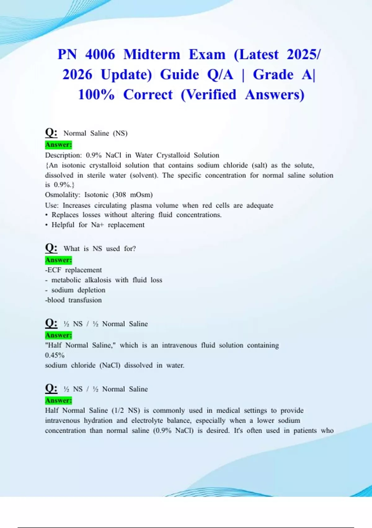 PN 4006 Midterm Exam (Latest 2025/ 2026 Update) Guide Q/A | Grade A| 100% Correct (Verified Answers) QUESTION Normal Saline (NS) Answer: Description: 0.9% NaCl in Water Crystalloid Solution {An isotonic crystalloid solution that contains sodium chloride (salt) as the solute, dissolved in sterile water (solvent). The specific concentration for normal saline solution is 0.9%.} Osmolality: Isotonic (308 mOsm) Use: Increases circulating plasma volume when red cells are adequate • Replaces losses without altering fluid concentrations. • Helpful for Na+ replacement QUESTION What is NS used for? Answer: -ECF replacement - metabolic alkalosis with fluid loss - sodium depletion -blood transfusion QUESTION ½ NS / ½ Normal Saline Answer: "Half Normal Saline," which is an intravenous fluid solution containing 0.45% sodium chloride (NaCl) dissolved in water. QUESTION ½ NS / ½ Normal Saline Answer: Half Normal Saline (1/2 NS) is commonly used in medical settings to provide intravenous hydration and electrolyte balance, especially when a lower sodium concentration than normal saline (0.9% NaCl) is desired. It's often used in patients who do not require as much sodium, such as those with certain medical conditions or during maintenance fluid therapy. QUESTION What is Ringer's lactate? Answer: sodium, chloride, calcium, potassium, and lactate dissolved in water QUESTION What is Ringer's lactate used for? Answer: Electrolyte replacement. contains Sodium, potassium, and calcium QUESTION what is D5w? Answer: 5% dextrose (sugar) in water. TKO IV, with a minidrip tubing QUESTION What is D5W used for? Answer: fluid loss, dehydration, hypernatremia QUESTION What is D5NS (0.9% NaCl in Dextrose 5%)? Answer: Hypertonic solution used in temporary treatment of shock IF plasma expanders not available *Do NOT use in cardiac or renal patients QUESTION What is d5ns used for? Answer: sodium and volume replacement QUESTION What is D51/2NS? Answer: 5% dextrose in 0.45% sodium chloride QUESTION What is D51/2NS used for? Answer: Tx of: dehydration, electrolytes, maintain fluid balance, provide energy for NPO patients QUESTION What kind of solution is normal saline Answer: isotonic QUESTION What kind of solution is ½ NS / ½ Normal Saline Answer: Hypotonic QUESTION What kind of solution is ringers lactate? Answer: Isotonic QUESTION What kind of solution is D5w? Answer: isotonic, hypotonic (after metabolization) QUESTION What kind of solution is D5NS? Answer: hypertonic QUESTION What kind of solution is D51/2NS? Answer: Isotonic QUESTION metabolic acidosis Answer: decreased pH in blood and body tissues as a result of an upset in metabolism QUESTION metabolic alkalosis Answer: elevation of HCO3- usually caused by an excessive loss of metabolic acids QUESTION respiratory acidosis Answer: A drop in blood pH due to hypoventilation (too little breathing) and a resulting accumulation of Co2. QUESTION respiratory alkalosis Answer: Arise in blood pH due to hyperventilation (excessive breathing) and a resulting decrease in CO2. QUESTION What is the pH scale? Answer: measures how acidic or basic a substance is QUESTION normal ph ranges in blood? Answer: 7.35-7.45