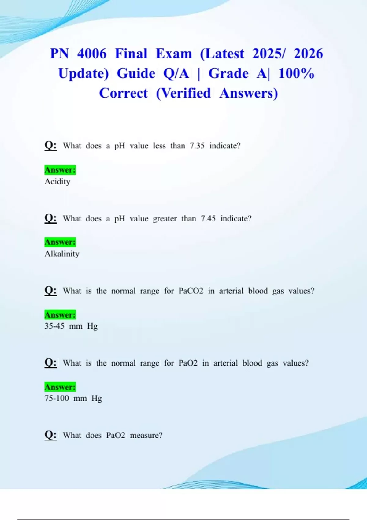 PN 4006 Final Exam (Latest 2025/ 2026 Update) Guide Q/A | Grade A| 100% Correct (Verified Answers) QUESTION What does a pH value less than 7.35 indicate? Answer: Acidity QUESTION What does a pH value greater than 7.45 indicate? Answer: Alkalinity QUESTION What is the normal range for PaCO2 in arterial blood gas values? Answer: 35-45 mm Hg QUESTION What is the normal range for PaO2 in arterial blood gas values? Answer: 75-100 mm Hg QUESTION What does PaO2 measure? Answer: The amount of O2 dissolved in plasma QUESTION What is the normal range for HCO3- in arterial blood gas values? Answer: 22-26 mEq/L QUESTION What does HCO3- represent in arterial blood gas values? Answer: Bicarbonate, a metabolic factor QUESTION What is the normal SaO2 percentage in arterial blood gas values? Answer: 95% or above QUESTION What does SaO2 measure?