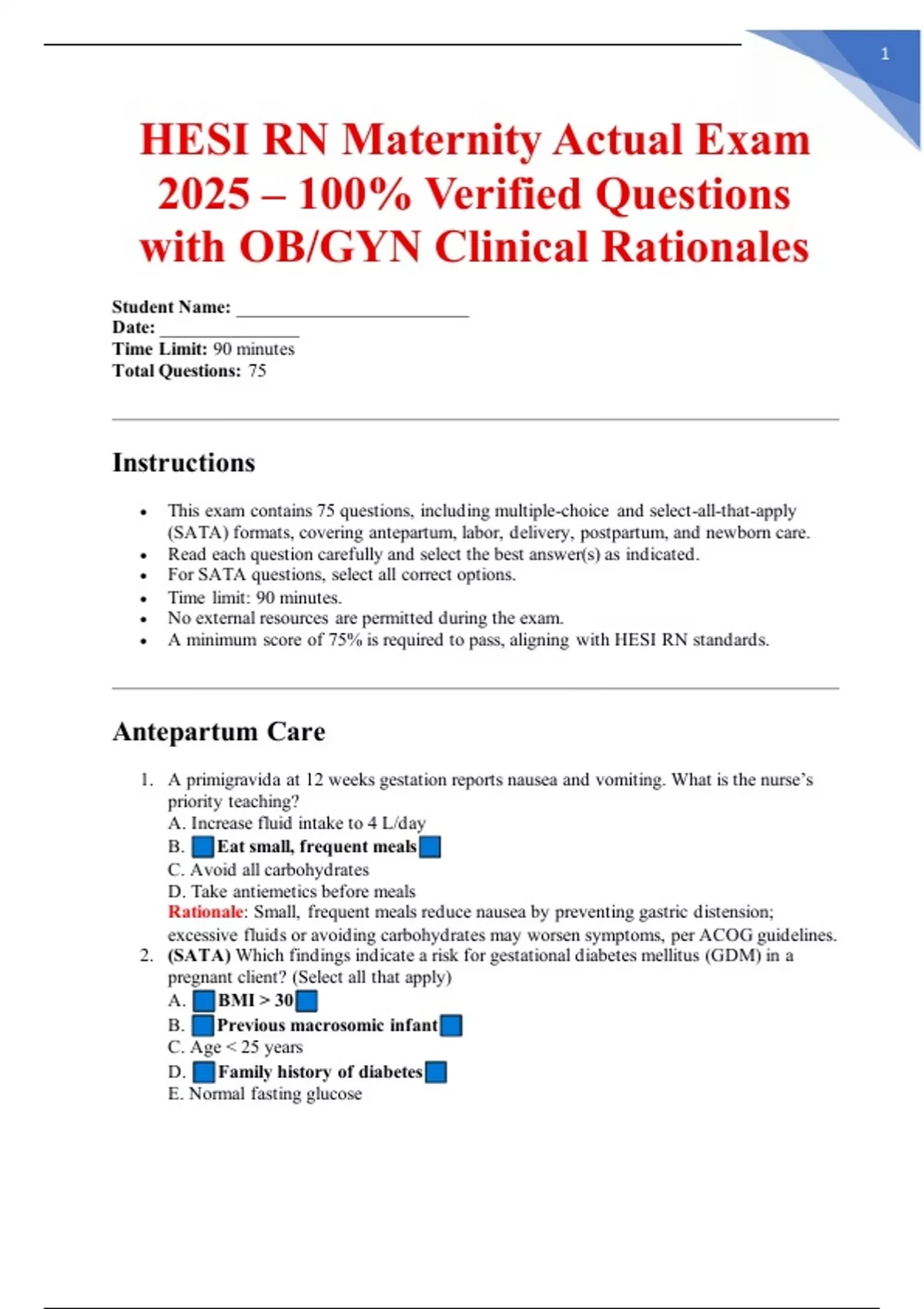 Ace the 2025 HESI RN Maternity Exam with this comprehensive study guide, featuring 70 authentic HESI-style questions, 100% verified answers, and detailed OB/GYN clinical rationales. Fully aligned with the 2025/2026 HESI and NCLEX-RN test plans, this resource ensures nursing students excel in maternity nursing and clinical practice. Perfect for HESI RN Maternity Exam prep, NCLEX-RN maternity review, or OB/GYN clinical rotations, this study set includes real-world scenarios to enhance clinical judgment and critical thinking. Download instantly on Stuvia for guaranteed success! What’s Included: 70 HESI RN Maternity questions focused on OB/GYN care 100% verified and accurate answers Detailed rationales with clinical OB/GYN applications Aligned with 2025/2026 HESI and NCLEX-RN standards Topics include: antepartum, intrapartum, postpartum, newborn care, complications, and more Perfect For: HESI RN Maternity Exam (2025/2026) NCLEX-RN maternity preparation OB/GYN clinical rotations Maternity nursing coursework review