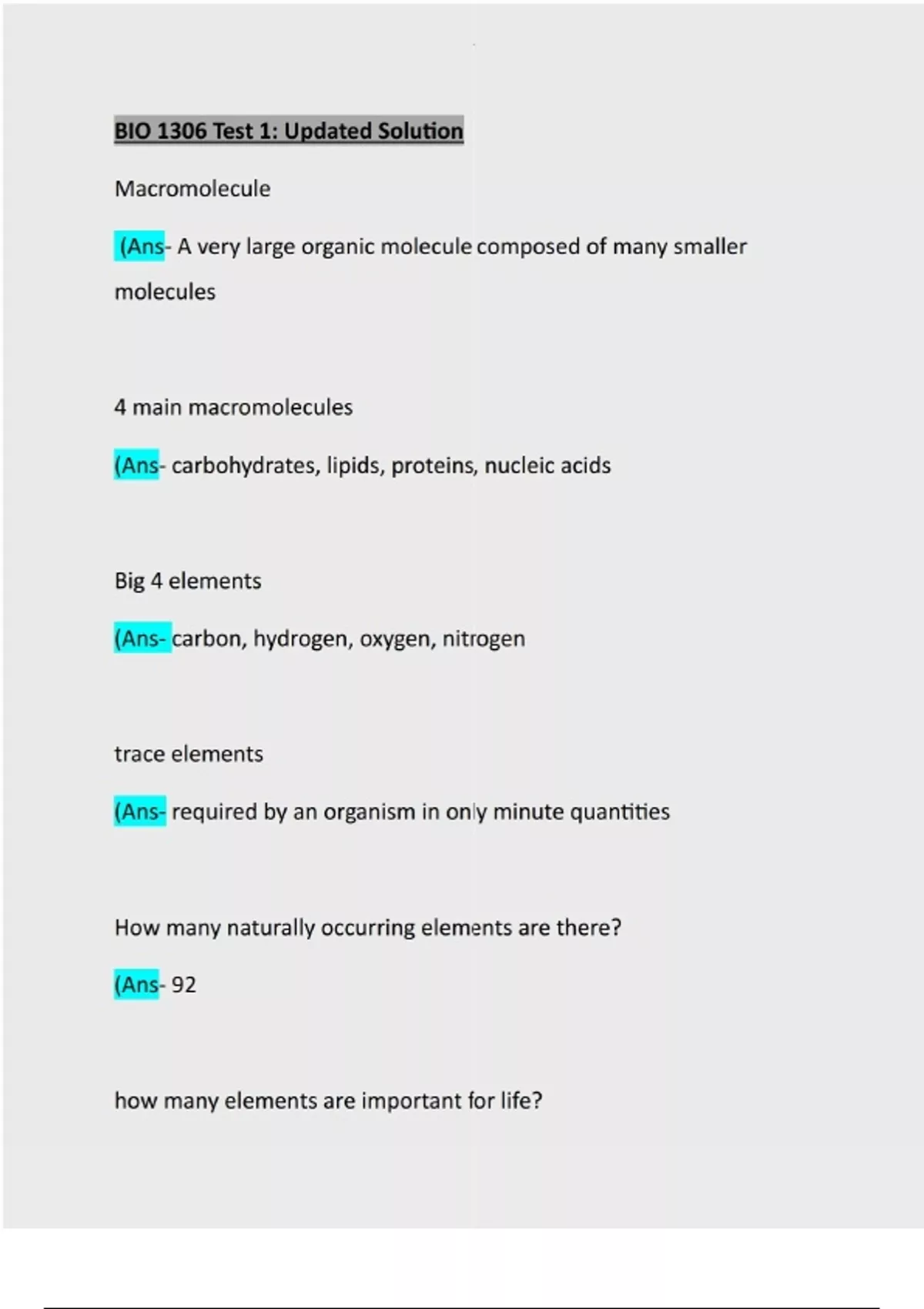 BIO 1306 Test 1: Updated Solution: Questions & Answers: Guaranteed A+ Score