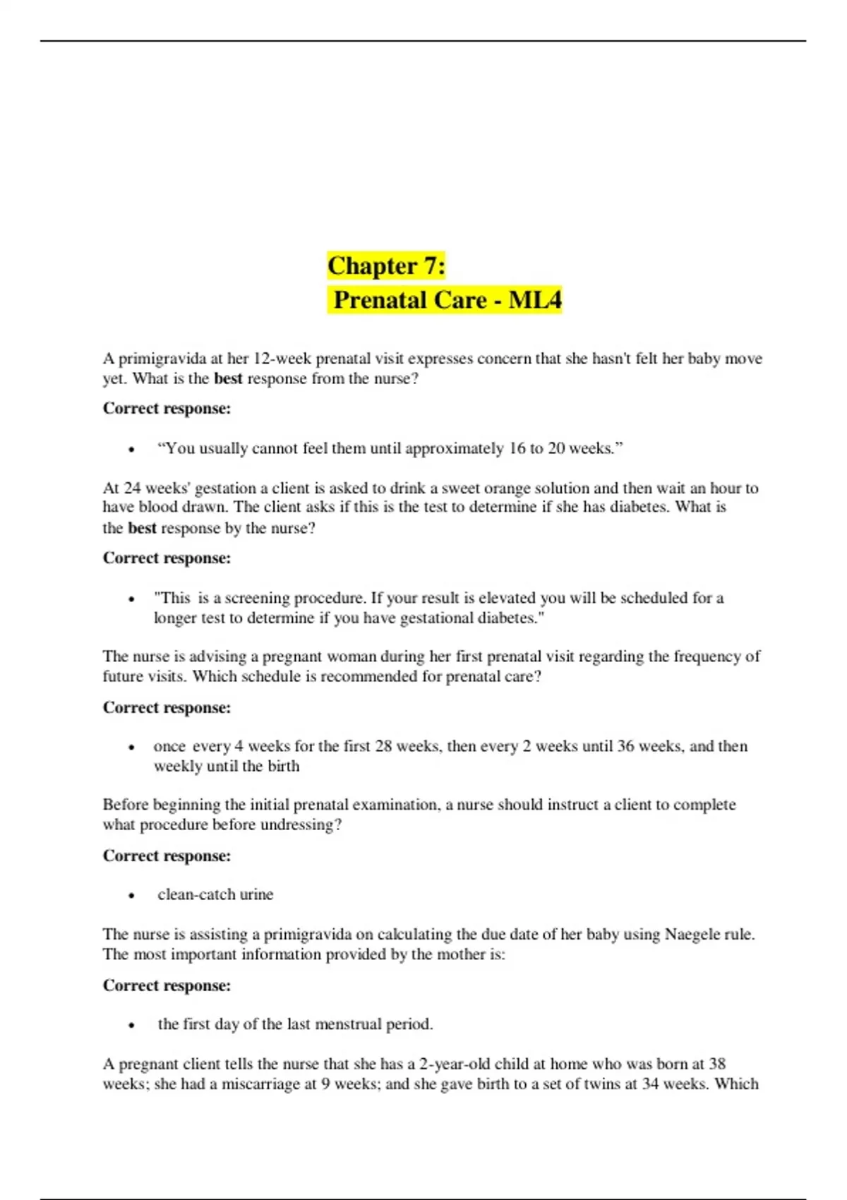 At 24 weeks' gestation a client is asked to drink a sweet orange solution and then wait an hour to have blood drawn. The client asks if this is the test to determine if she has diabetes. What is the best response by the nurse? Correct response: • "This is a screening procedure. If your result is elevated you will be scheduled for a longer test to determine if you have gestational diabetes."