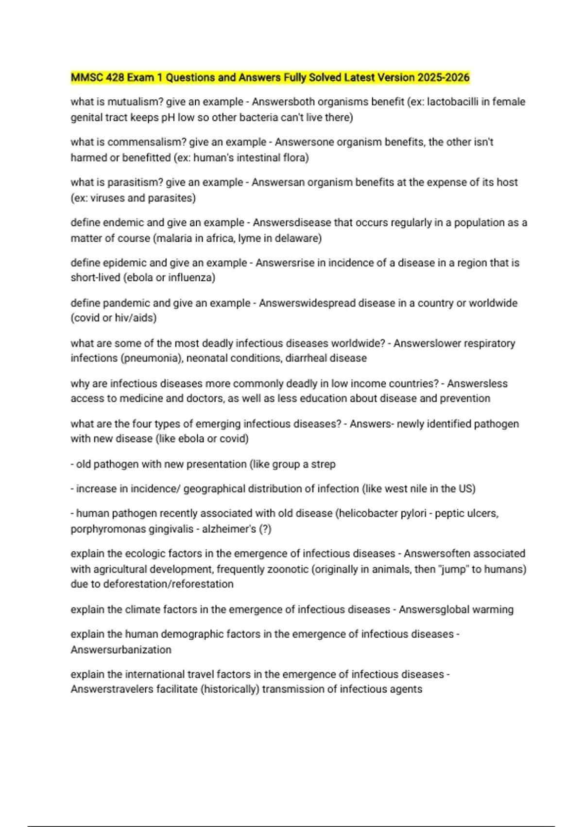 MMSC 428 Exam 1 Questions and Answers Fully Solved Latest Version what is mutualism? give an example - Answersboth organisms benefit (ex: lactobacilli in female genital tract keeps pH low so other bacteria can't live there) what is commensalism? give an example - Answersone organism benefits, the other isn't harmed or benefitted (ex: human's intestinal flora) what is parasitism? give an example - Answersan organism benefits at the expense of its host (ex: viruses and parasites) define endemic and give an example - Answersdisease that occurs regularly in a population as a matter of course (malaria in africa, lyme in delaware) define epidemic and give an example - Answersrise in incidence of a disease in a region that is short-lived (ebola or influenza) define pandemic and give an example - Answerswidespread disease in a country or worldwide (covid or hiv/aids) what are some of the most deadly infectious diseases worldwide? - Answerslower respiratory infections (pneumonia), neonatal conditions, diarrheal disease why are infectious diseases more commonly deadly in low income countries? - Answersless access to medicine and doctors, as well as less education about disease and prevention what are the four types of emerging infectious diseases? - Answers- newly identified pathogen with new disease (like ebola or covid) - old pathogen with new presentation (like group a strep - increase in incidence/ geographical distribution of infection (like west nile in the US) - human pathogen recently associated with old disease (helicobacter pylori - peptic ulcers, porphyromonas gingivalis - alzheimer's (?) explain the ecologic factors in the emergence of infectious diseases - Answersoften associated with agricultural development, frequently zoonotic (originally in animals, then "jump" to humans) due to deforestation/reforestation explain the climate factors in the emergence of infectious diseases - Answersglobal warming explain the human demographic factors in the emergence of infectious diseases - Answersurbanization explain the international travel factors in the emergence of infectious diseases - Answerstravelers facilitate (historically) transmission of infectious agents explain the shipping/transport factors in the emergence of infectious diseases - Answers- mosquitoes in shipping containers carrying dengue and yellow fever - microorganisms (like cholera) living in ppl and brought to other countries - anthrax found in animal wool/food when not cleaned/sterilized properly explain the public health factors in the emergence of infectious diseases - Answers- public health and sanitation, monitoring inspection of food for e. coli (meat and produce), salmonella (chicken and eggs), listeria (dairy) - drinking water/waterborne pathogens explain the adaptability of microorganisms factor in the emergence of infectious diseases - Answers- microogranisms reproduce and evolve faster than ppl - resistance to antimicrobial agents AMR/AR) explain how biofilms work - Answers- biofilms build up in pipes that run drinking water - start small, build bubbles, then burst and release bacteria into the water - planktonic: the bacteria released - sessile: bacterial secretions formed in the biofilm define antibiotic resistance - Answerswhen bacteria and fungi develop the ability to defeat the antibiotics designed to kill them how do people develop HAIs (nosocomial infections)? - Answerswhile receiving care in a hospital/healthcare setting (abt 1/25 are affected), and a lower rate of incidence is a reflec