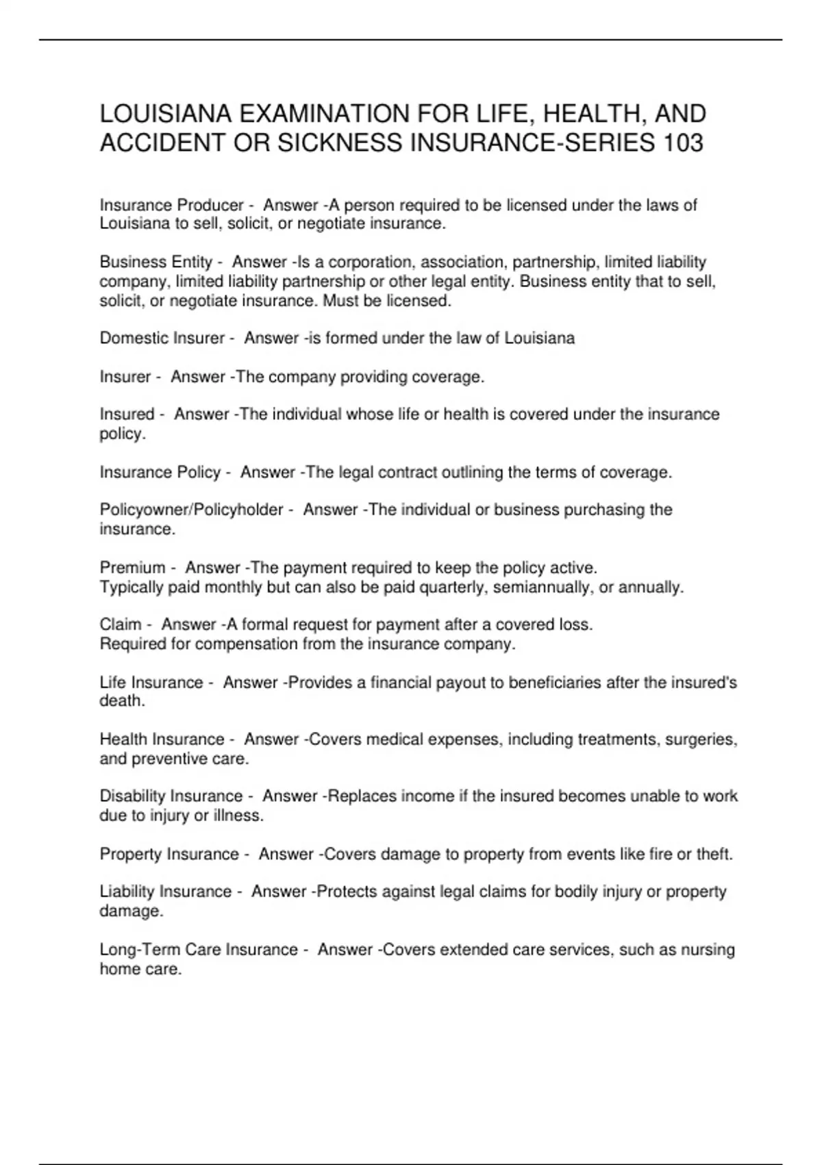 Premium - Answer -The payment required to keep the policy active. Typically paid monthly but can also be paid quarterly, semiannually, or annually. Claim - Answer -A formal request for payment after a covered loss. Required for compensation from the insurance company. Life Insurance - Answer -Provides a financial payout to beneficiaries after the insured's death. Health Insurance - Answer -Covers medical expenses, including treatments, surgeries, and preventive care. Disability Insurance - Answer -Replaces income if the insured becomes unable to work due to injury or illness. Property Insurance - Answer -Covers damage to property from events like fire or theft. Liability Insurance - Answer -Protects against legal claims for bodily injury or property damage. Long-Term Care Insurance - Answer -Covers extended care services, such as nursing home care.