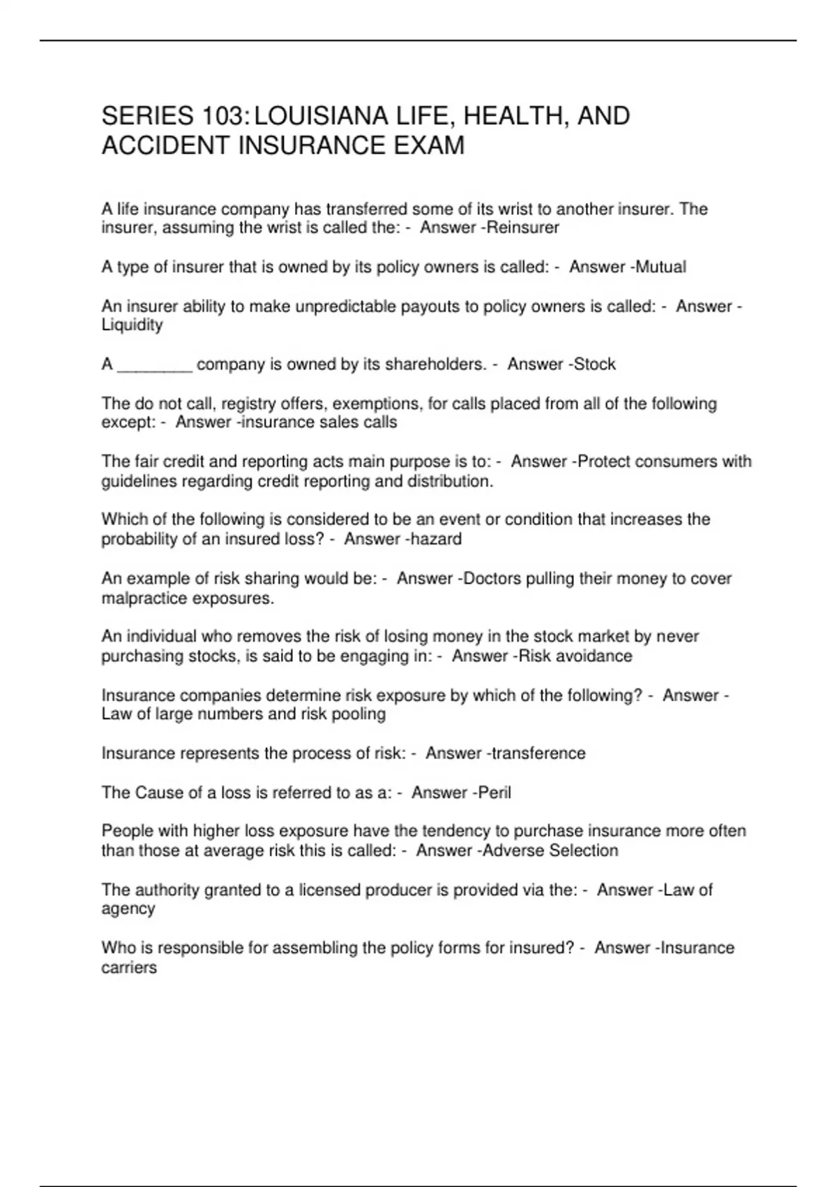 SERIES 103: LOUISIANA LIFE, HEALTH, AND ACCIDENT INSURANCE EXAM