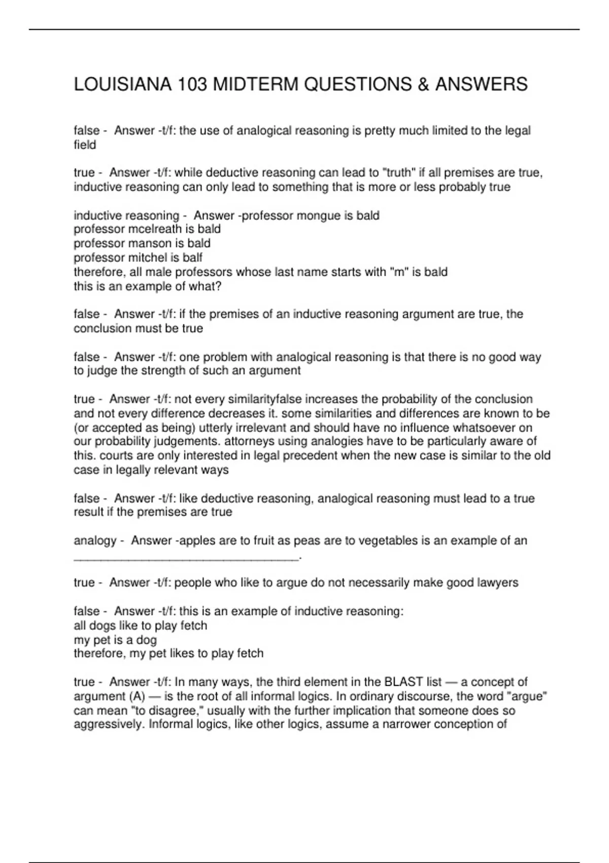 LOUISIANA 103 MIDTERM QUESTIONS & ANSWERS