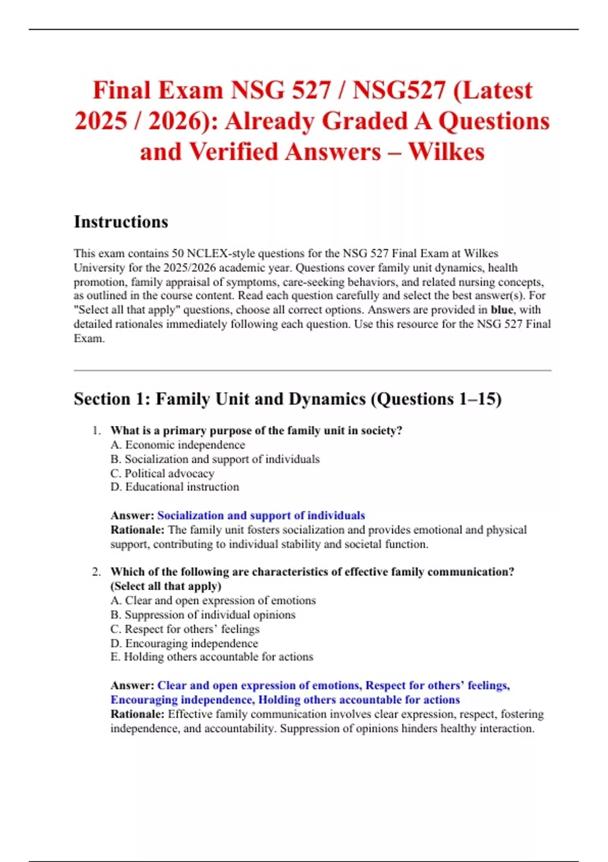 Final Exam NSG 527 / NSG527 (Latest 2025 / 2026): Already Graded A Questions and Verified Answers - Wilkes