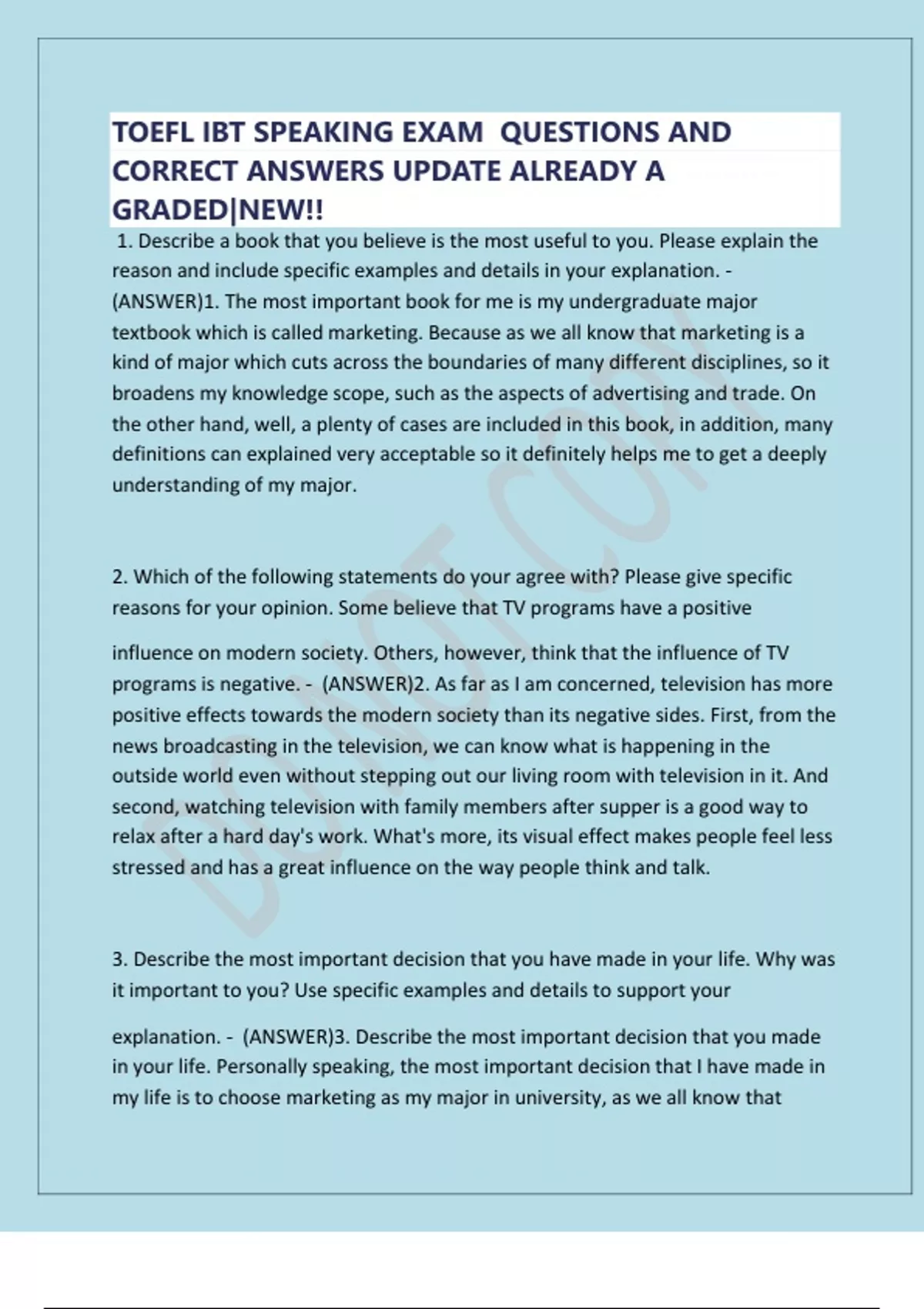 TOEFL IBT SPEAKING EXAM QUESTIONS AND